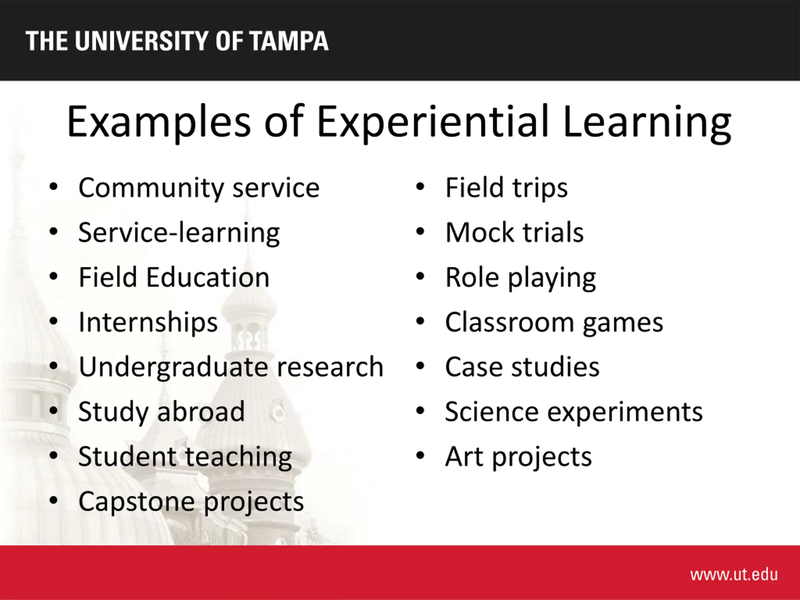 Examples of Experiential Learning Community service Service-learning Field Education Internships Undergraduate research Study abroad Student teaching Capstone projects Field trips Mock trials Role playing Classroom games Case studies Science experiments Art projects