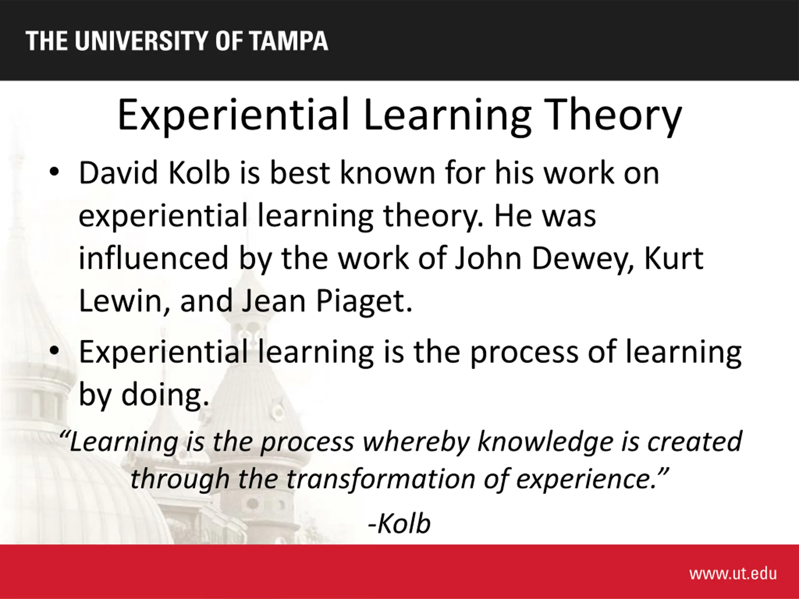 Experiential Learning Theory David Kolb is best known for his work on experiential learning theory. He was influenced by the work of John Dewey, Kurt Lewin, and Jean Piaget. Experiential learning is the process of learning by doing. Learning is the process whereby knowledge is created through the transformation of experience. -Kolb
