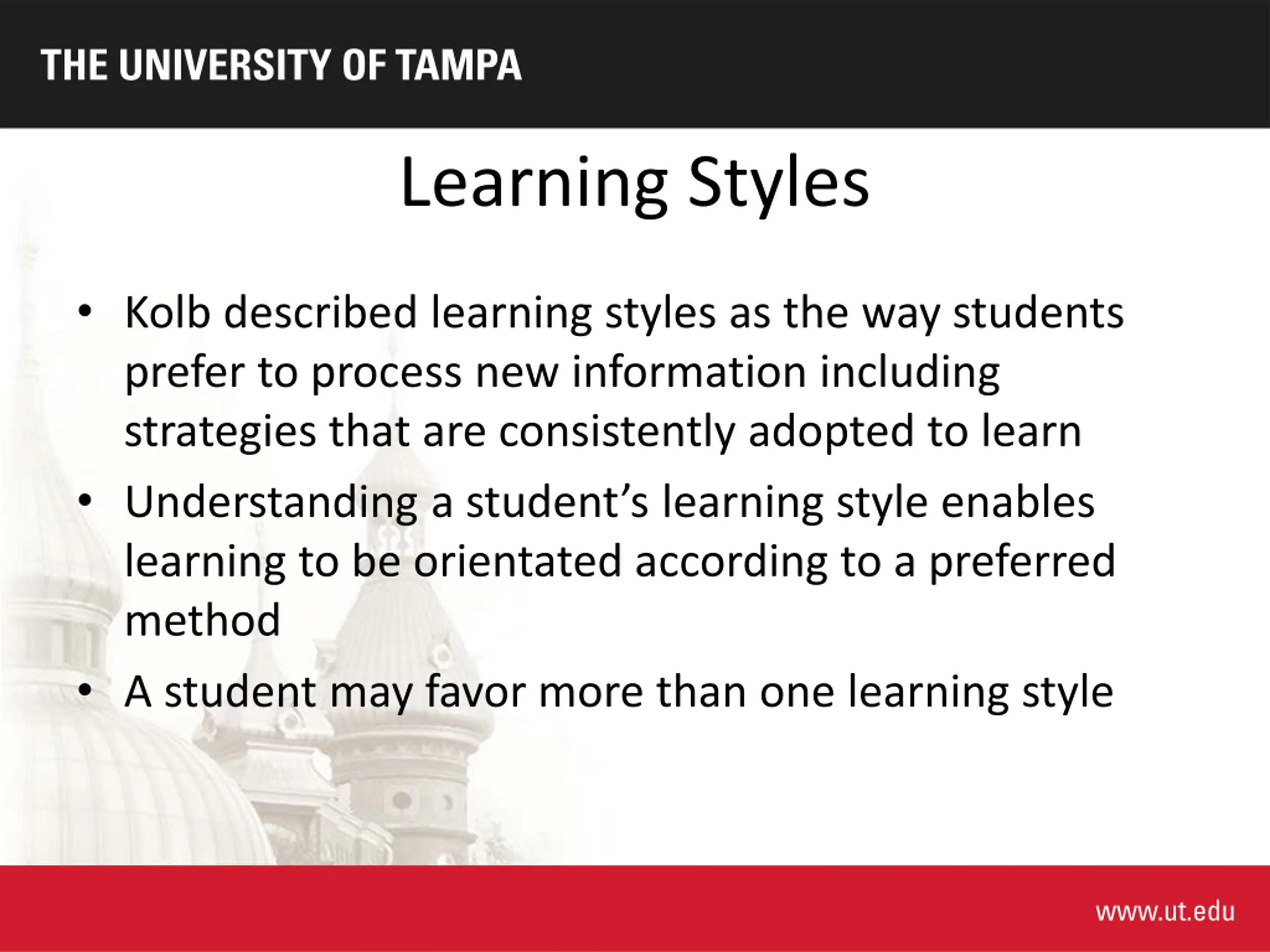 Learning Styles Kolb described learning styles as the way students prefer to process new information including strategies that are consistently adopted to learn Understanding a student s learning style enables learning to be orientated according to a preferred method A student may favor more than one learning style