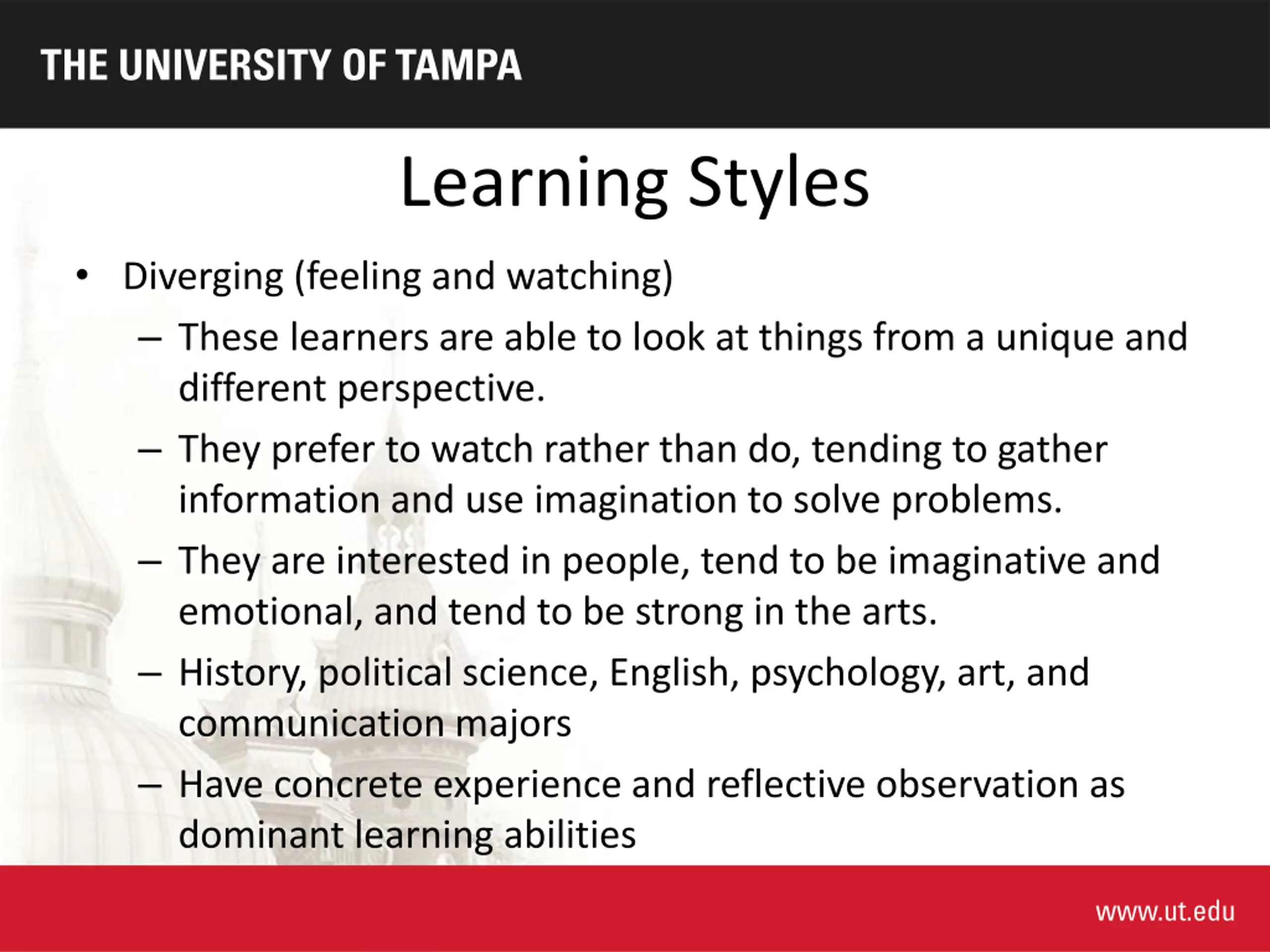 Learning Styles Diverging (feeling and watching) These learners are able to look at things from a unique and different perspective. They prefer to watch rather than do, tending to gather information and use imagination to solve problems. They are interested in people, tend to be imaginative and emotional, and tend to be strong in the arts. History, political science, English, psychology, art, and communication majors Have concrete experience and reflective observation as dominant learning abilities