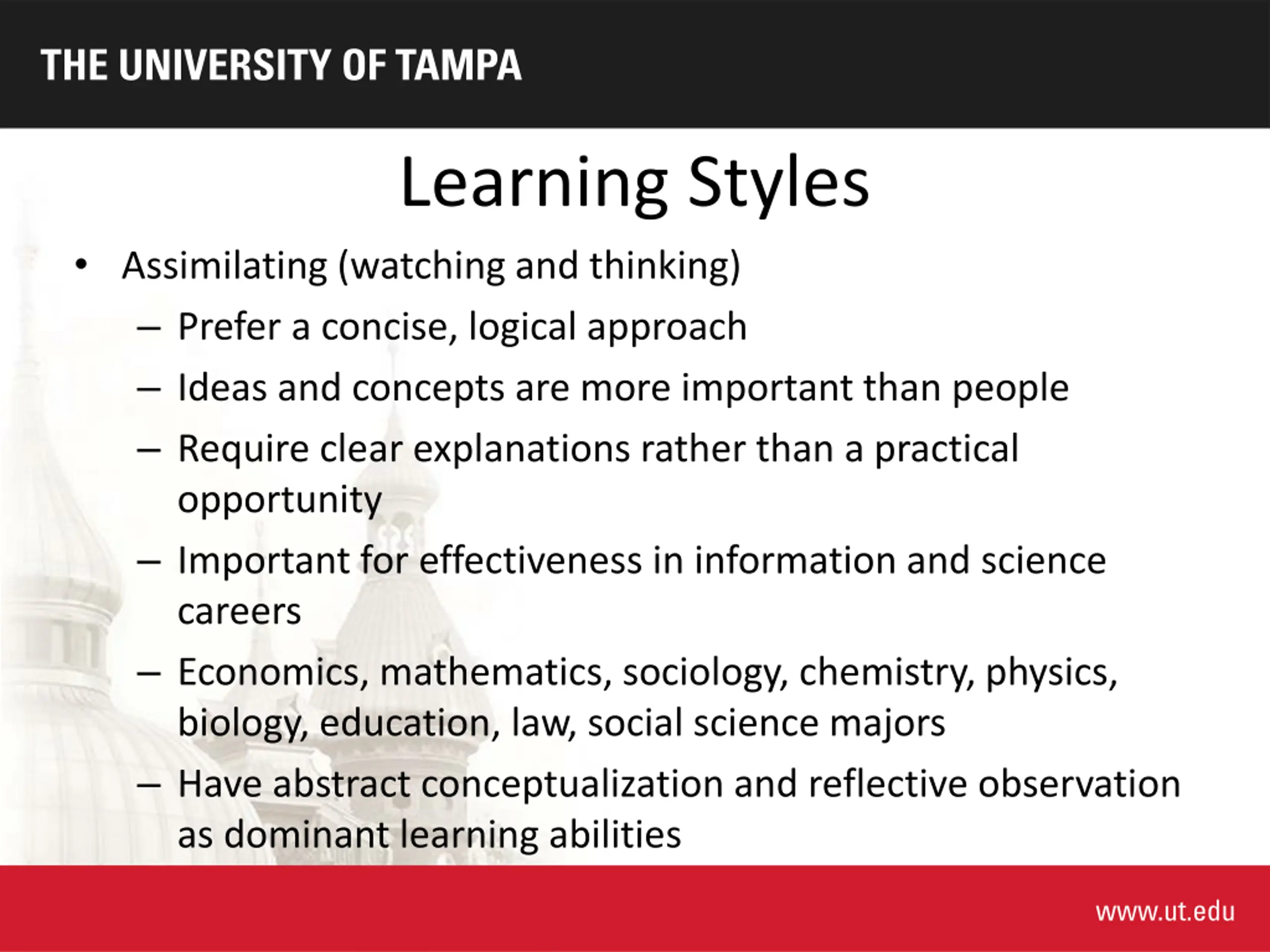 Learning Styles Assimilating (watching and thinking) Prefer a concise, logical approach Ideas and concepts are more important than people Require clear explanations rather than a practical opportunity Important for effectiveness in information and science careers Economics, mathematics, sociology, chemistry, physics, biology, education, law, social science majors Have abstract conceptualization and reflective observation as dominant learning abilities