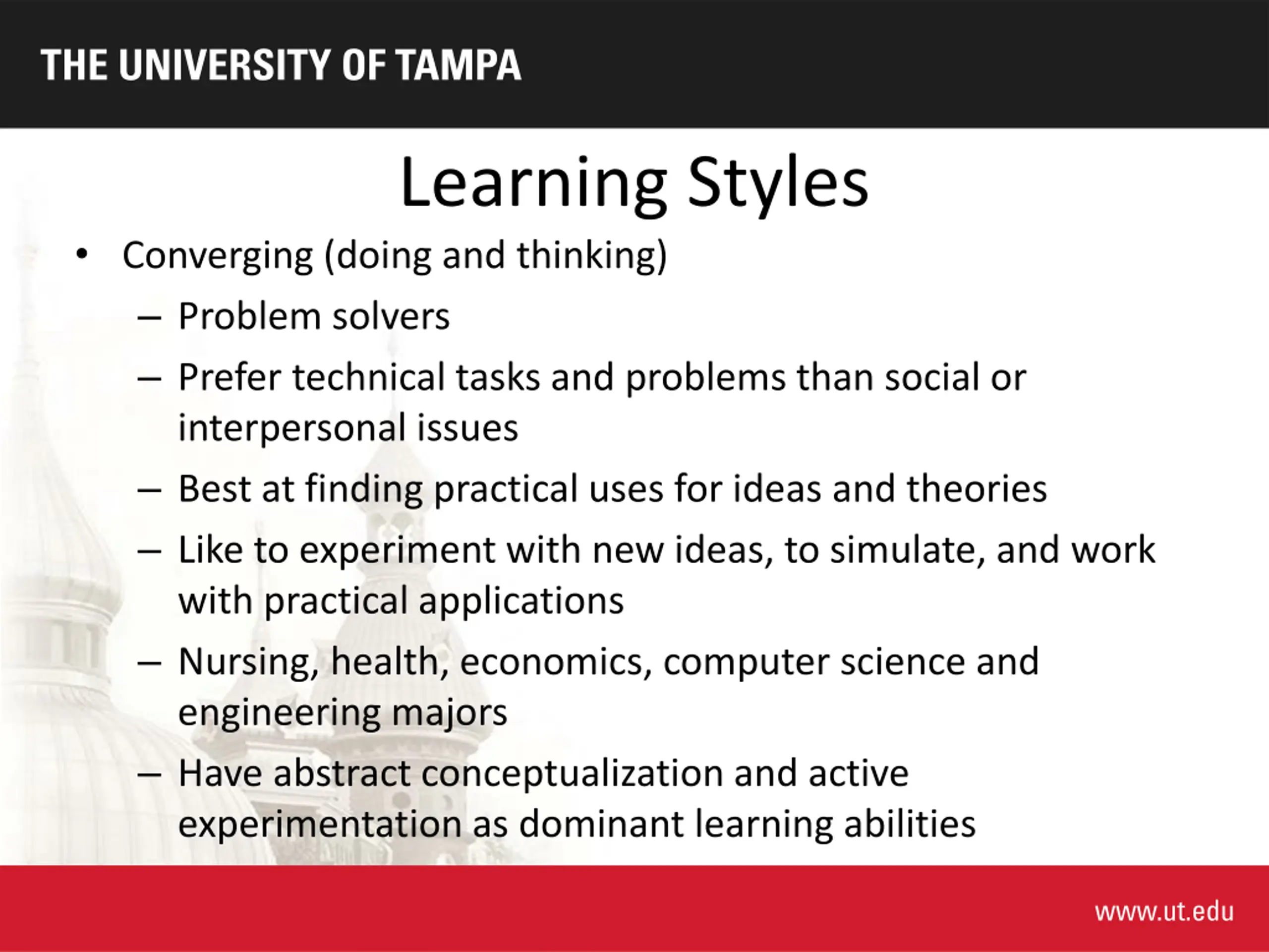 Learning Styles Converging (doing and thinking) Problem solvers Prefer technical tasks and problems than social or interpersonal issues Best at finding practical uses for ideas and theories Like to experiment with new ideas, to simulate, and work with practical applications Nursing, health, economics, computer science and engineering majors Have abstract conceptualization and active experimentation as dominant learning abilities