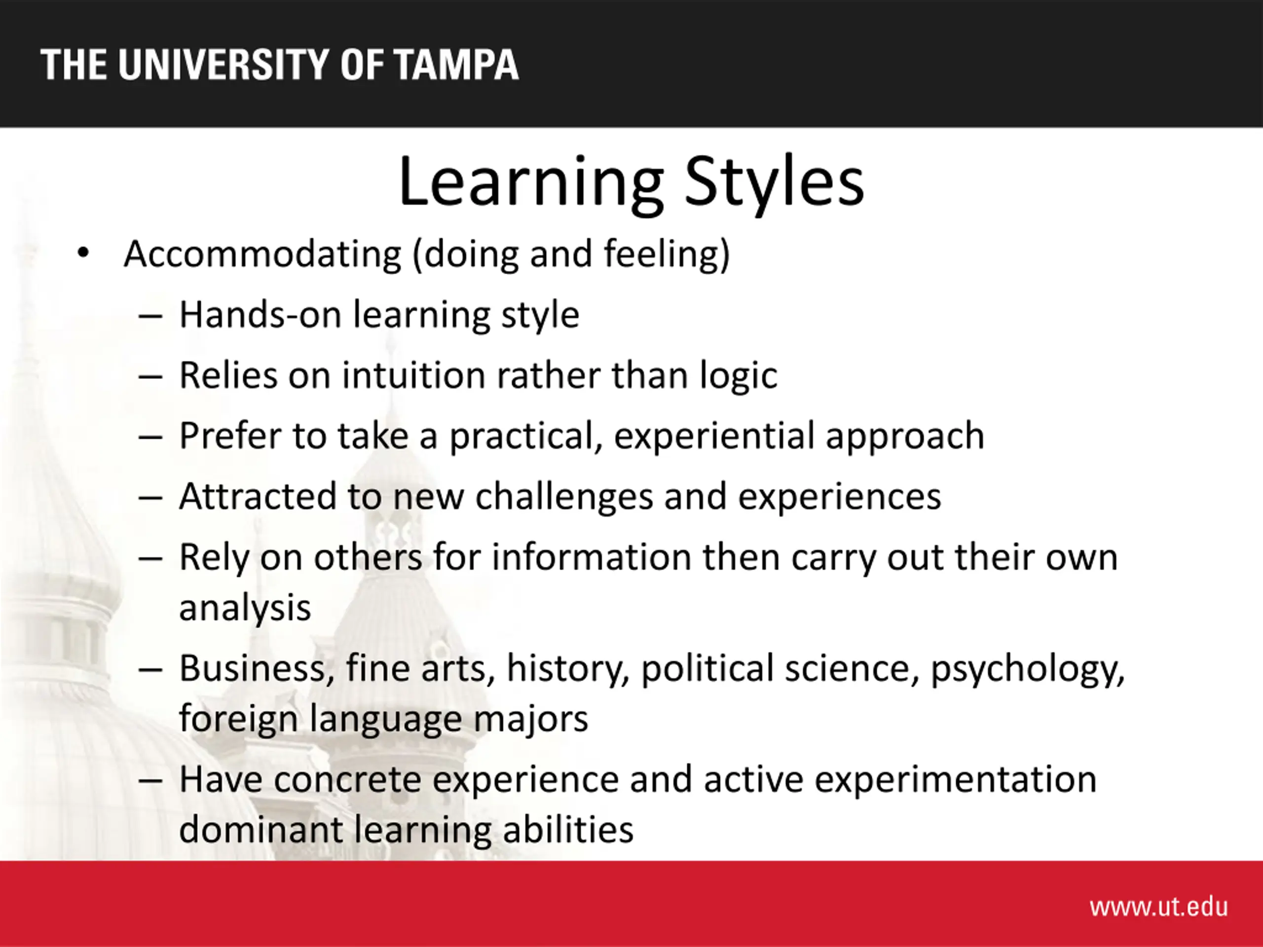 Learning Styles Accommodating (doing and feeling) Hands-on learning style Relies on intuition rather than logic Prefer to take a practical, experiential approach Attracted to new challenges and experiences Rely on others for information then carry out their own analysis Business, fine arts, history, political science, psychology, foreign language majors Have concrete experience and active experimentation dominant learning abilities
