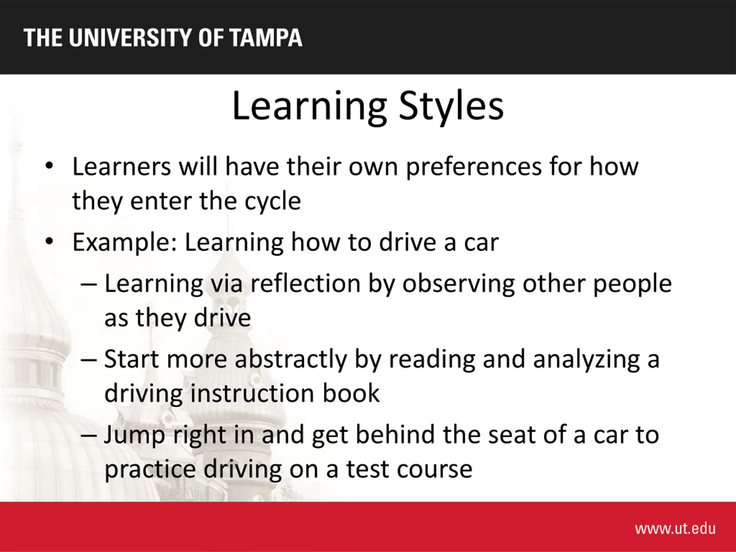 Learning Styles Learners will have their own preferences for how they enter the cycle Example: Learning how to drive a car Learning via reflection by observing other people as they drive Start more abstractly by reading and analyzing a driving instruction book Jump right in and get behind the seat of a car to practice driving on a test course