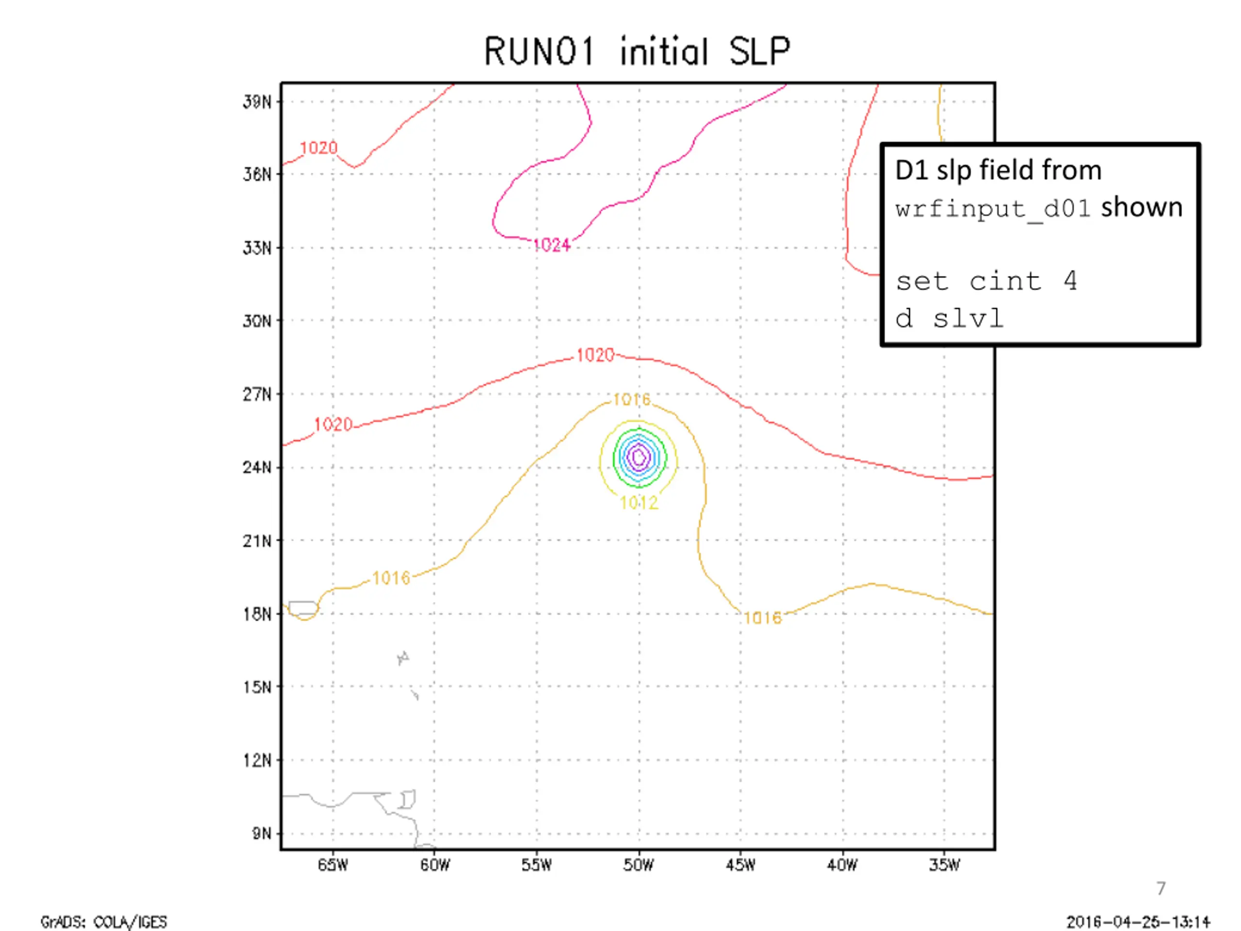 D1 slp field from wrfinput_d01 shown set cint 4 d slvl 7