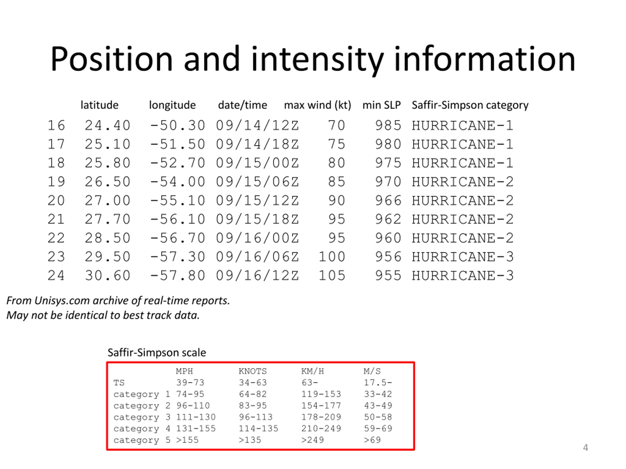 Position and intensity information latitude longitude date/time max wind (kt) min SLP Saffir-Simpson category 16 24.40 -50.30 09/14/12Z 70 985 HURRICANE-1 17 25.10 -51.50 09/14/18Z 75 980 HURRICANE-1 18 25.80 -52.70 09/15/00Z 80 975 HURRICANE-1 19 26.50 -54.00 09/15/06Z 85 970 HURRICANE-2 20 27.00 -55.10 09/15/12Z 90 966 HURRICANE-2 21 27.70 -56.10 09/15/18Z 95 962 HURRICANE-2 22 28.50 -56.70 09/16/00Z 95 960 HURRICANE-2 23 29.50 -57.30 09/16/06Z 100 956 HURRICANE-3 24 30.60 -57.80 09/16/12Z 105 955 HURRICANE-3 From Unisys.com archive of real-time reports. May not be identical to best track data. Saffir-Simpson scale MPH 39-73 KNOTS 34-63 64-82 83-95 96-113 114-135 >135 KM/H 63- 119-153 154-177 178-209 210-249 >249 M/S 17.5- 33-42 43-49 50-58 59-69 >69 TS category 1 74-95 category 2 96-110 category 3 111-130 category 4 131-155 category 5 >155 4
