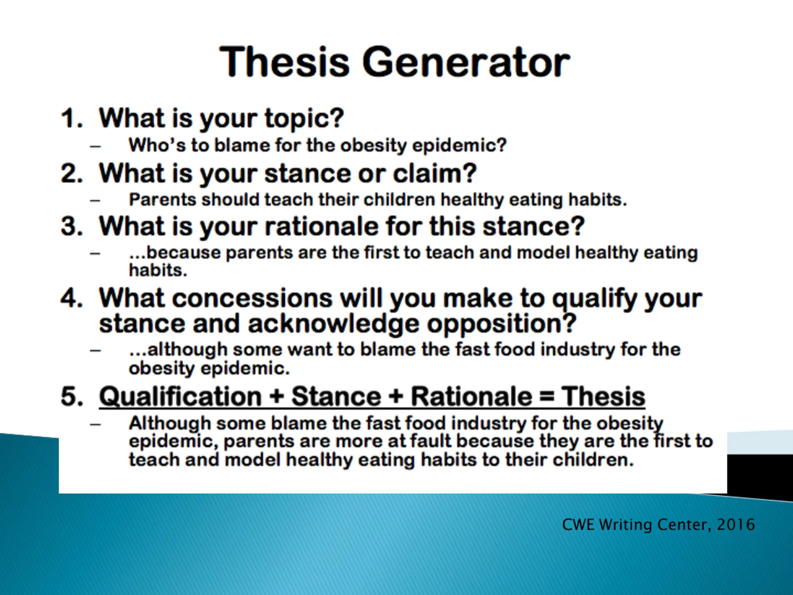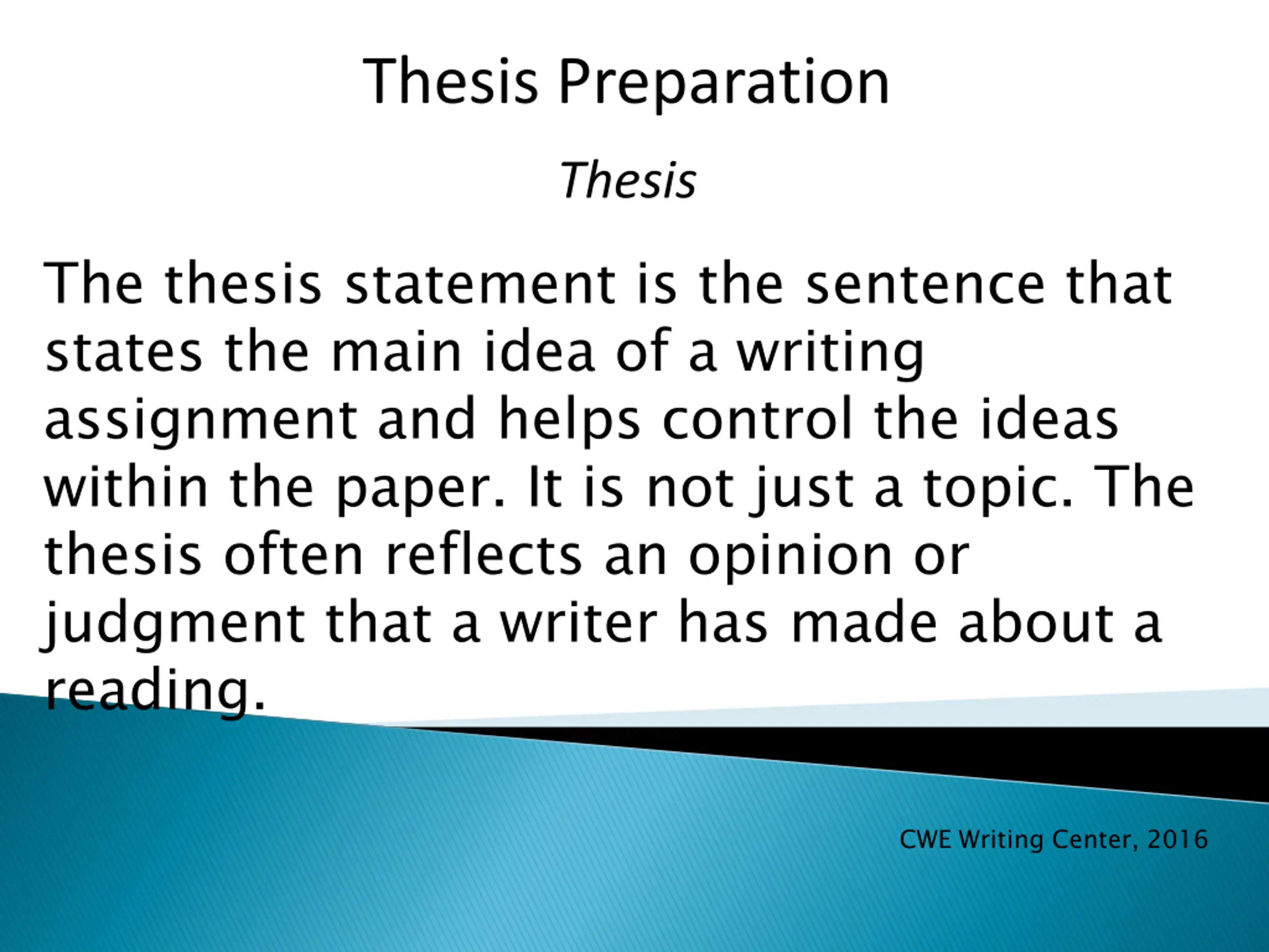 Thesis Preparation Thesis The thesis statement is the sentence that states the main idea of a writing assignment and helps control the ideas within the paper. It is not just a topic. The thesis often reflects an opinion or judgment that a writer has made about a reading. CWE Writing Center, 2016