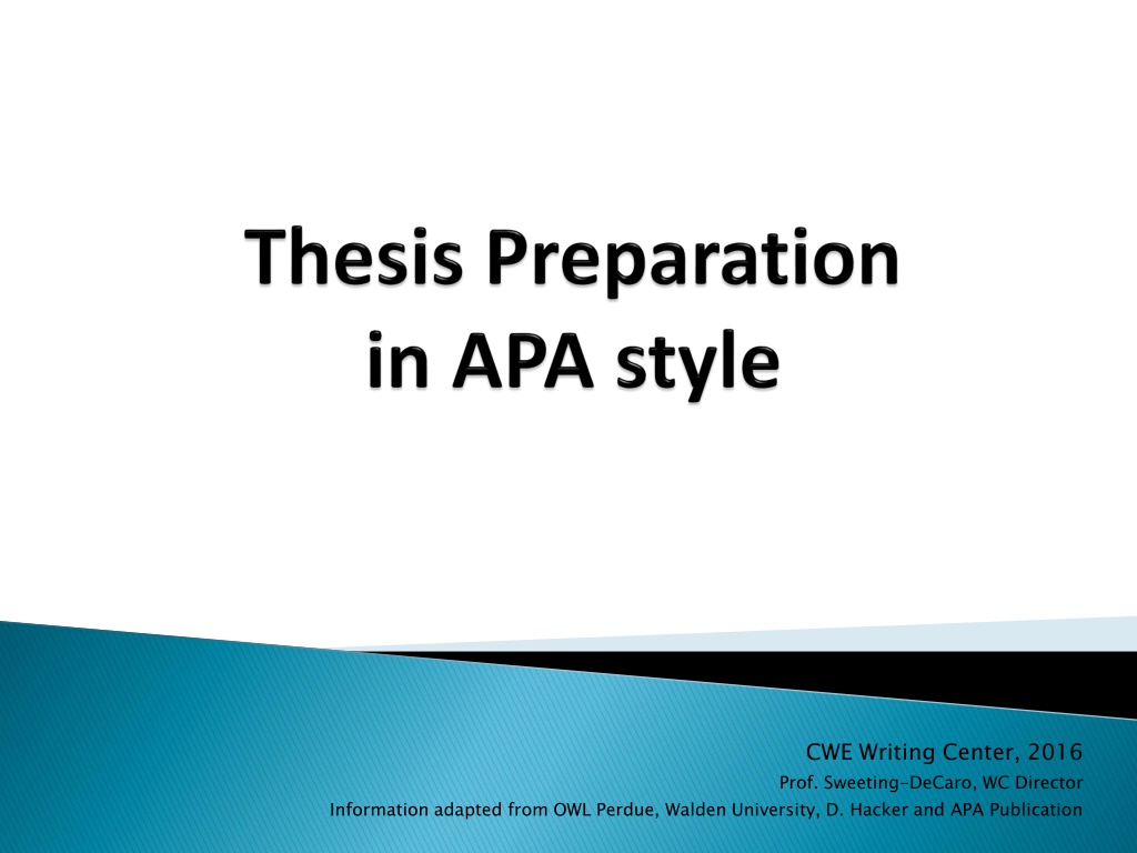 CWE Writing Center, 2016 Prof. Sweeting-DeCaro, WC Director Information adapted from OWL Perdue, Walden University, D. Hacker and APA Publication