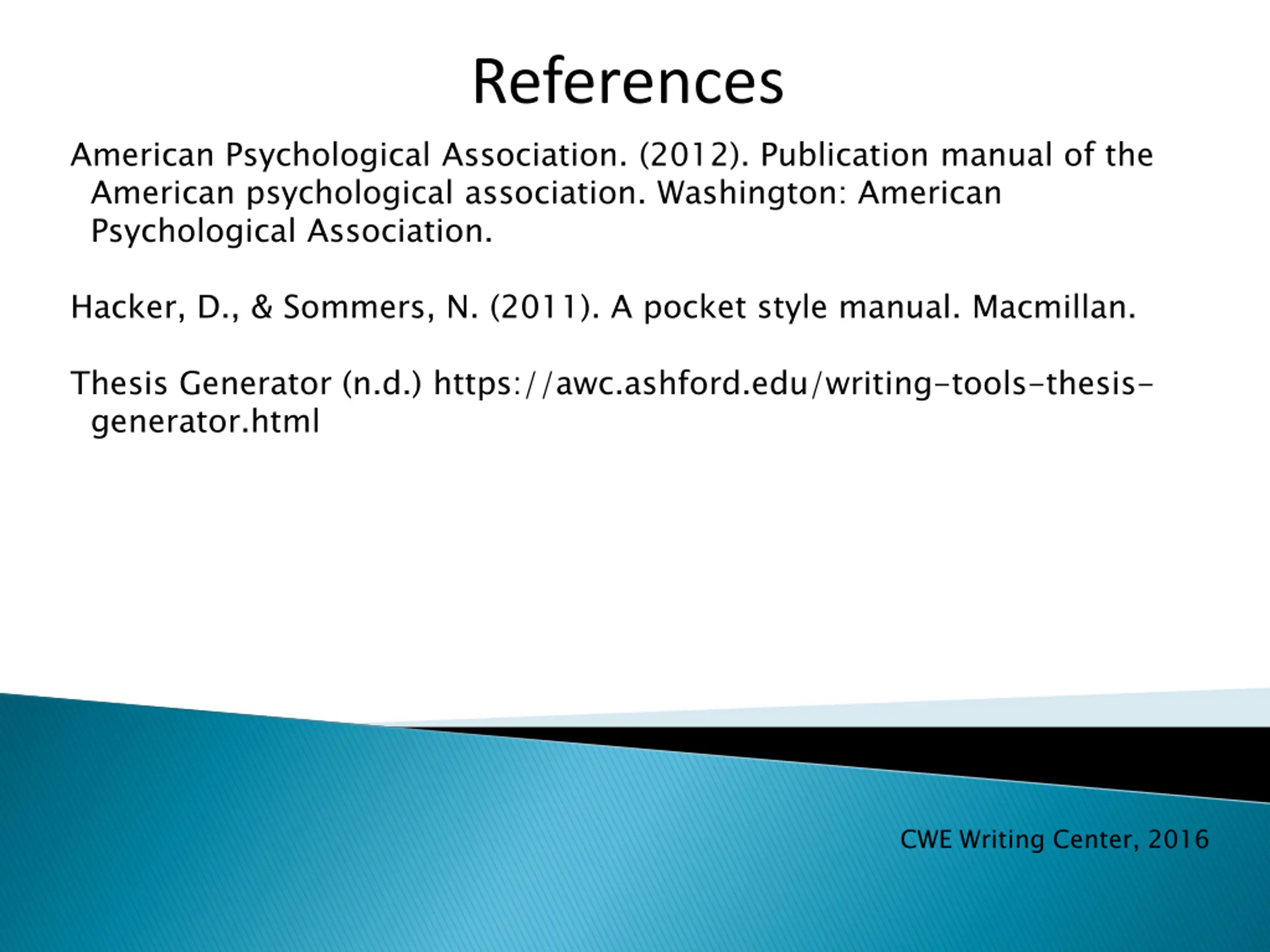 References American Psychological Association. (2012). Publication manual of the American psychological association. Washington: American Psychological Association. Hacker, D., & Sommers, N. (2011). A pocket style manual. Macmillan. Thesis Generator (n.d.) https://awc.ashford.edu/writing-tools-thesis- generator.html CWE Writing Center, 2016