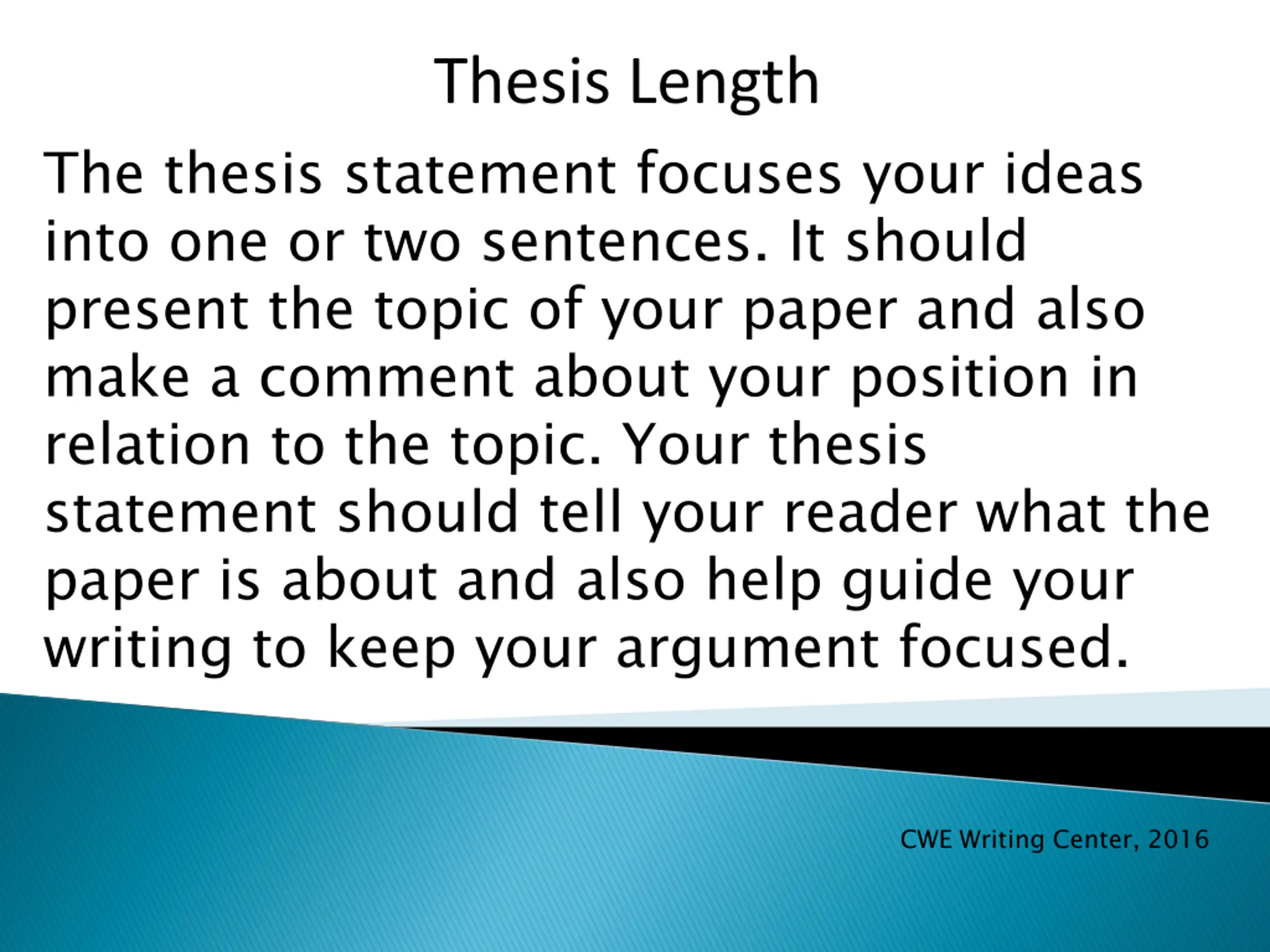 Thesis Length The thesis statement focuses your ideas into one or two sentences. It should present the topic of your paper and also make a comment about your position in relation to the topic. Your thesis statement should tell your reader what the paper is about and also help guide your writing to keep your argument focused. CWE Writing Center, 2016