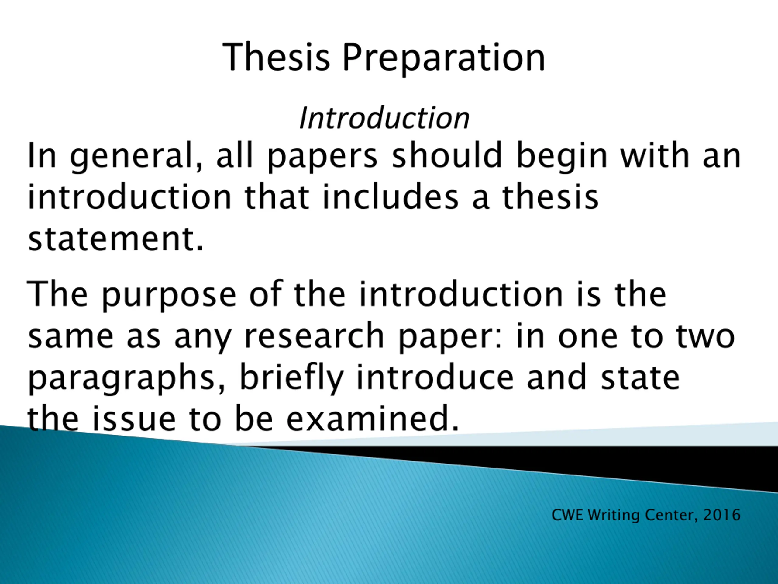 Thesis Preparation Introduction In general, all papers should begin with an introduction that includes a thesis statement. The purpose of the introduction is the same as any research paper: in one to two paragraphs, briefly introduce and state the issue to be examined. CWE Writing Center, 2016