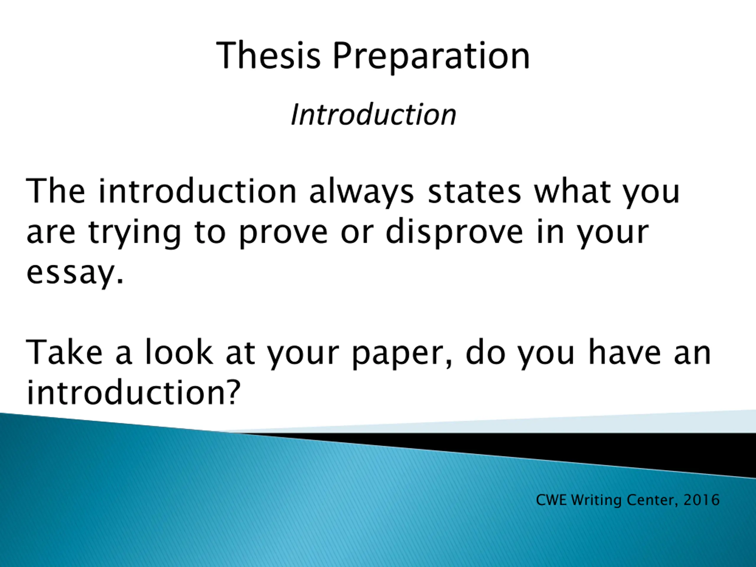 Thesis Preparation Introduction The introduction always states what you are trying to prove or disprove in your essay. Take a look at your paper, do you have an introduction? CWE Writing Center, 2016