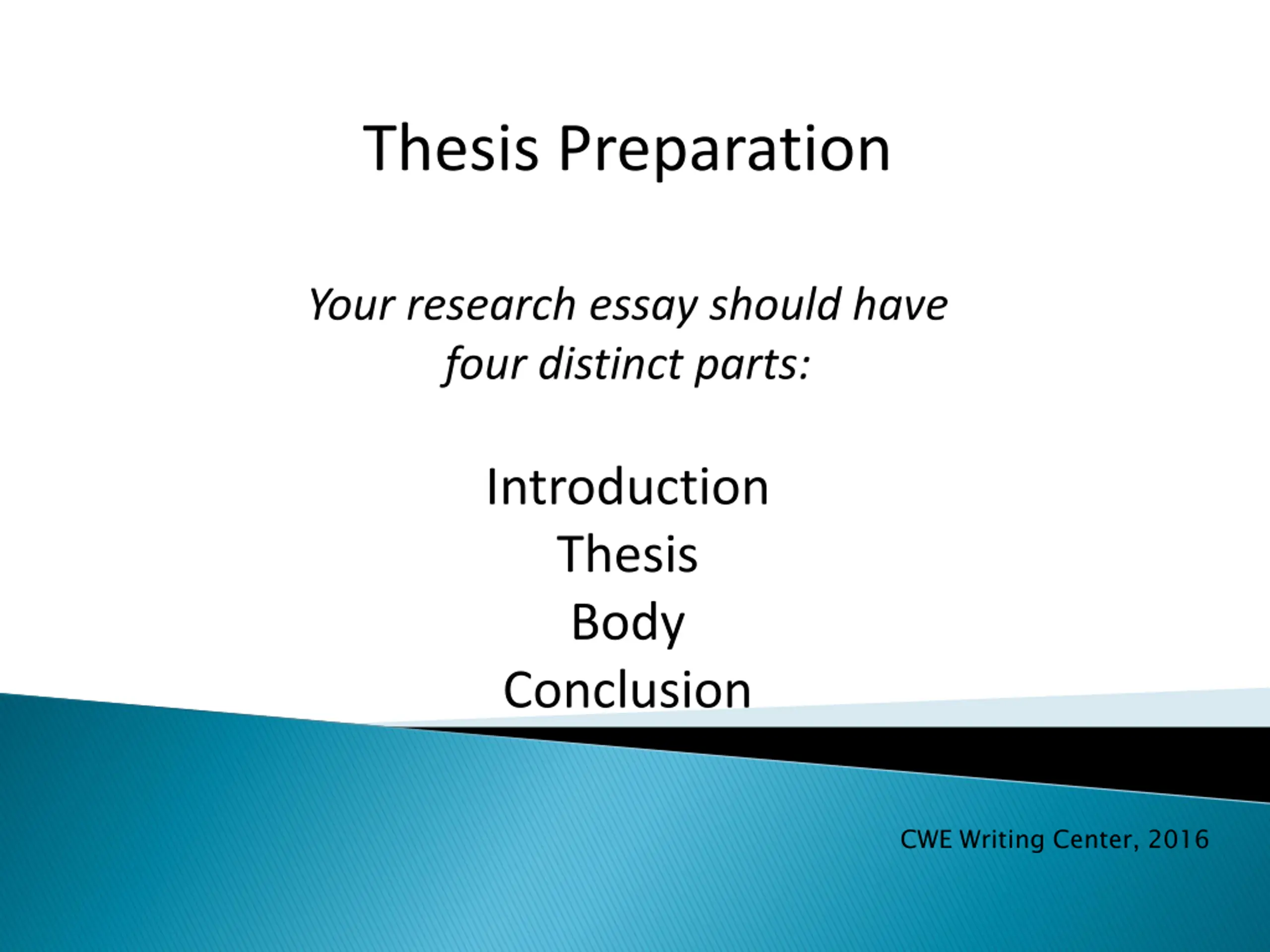 Thesis Preparation Your research essay should have four distinct parts: Introduction Thesis Body Conclusion CWE Writing Center, 2016