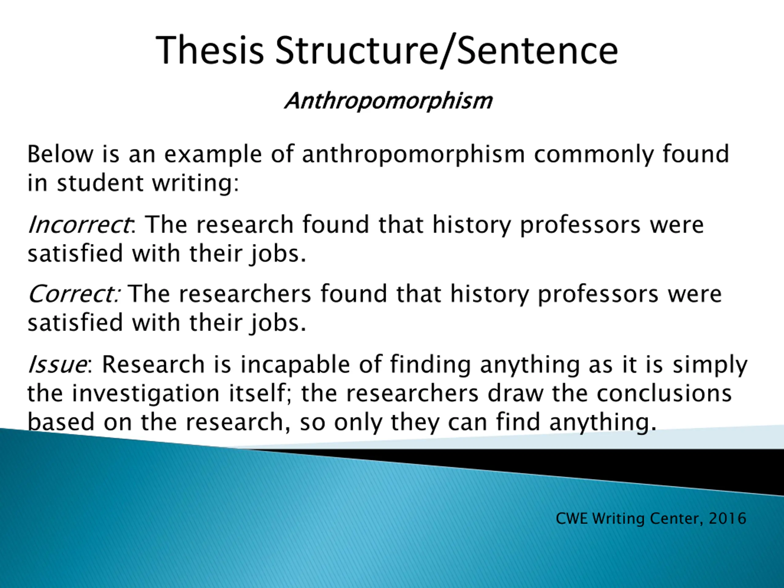 Thesis Structure/Sentence Anthropomorphism Anthropomorphism Below is an example of anthropomorphism commonly found in student writing: Incorrect: The research found that history professors were satisfied with their jobs. Correct: The researchers found that history professors were satisfied with their jobs. Issue: Research is incapable of finding anything as it is simply the investigation itself; the researchers draw the conclusions based on the research, so only they can find anything. CWE Writing Center, 2016