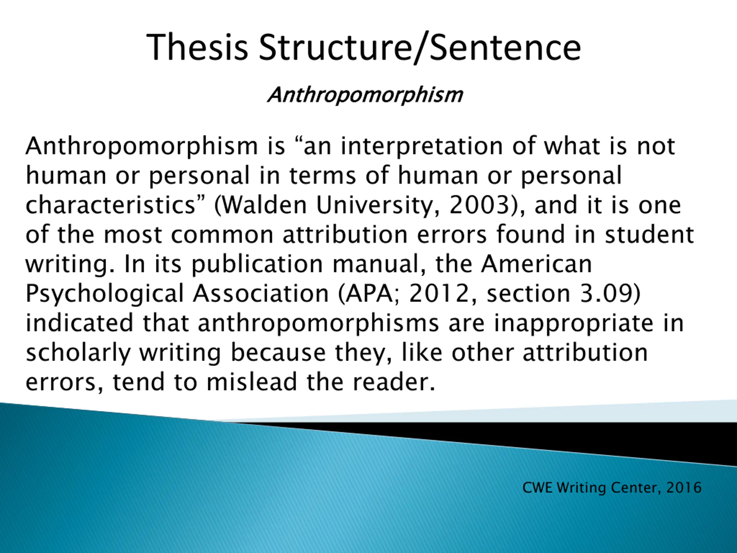 Thesis Structure/Sentence Anthropomorphism Anthropomorphism Anthropomorphism is an interpretation of what is not human or personal in terms of human or personal characteristics (Walden University, 2003), and it is one of the most common attribution errors found in student writing. In its publication manual, the American Psychological Association (APA; 2012, section 3.09) indicated that anthropomorphisms are inappropriate in scholarly writing because they, like other attribution errors, tend to mislead the reader. CWE Writing Center, 2016