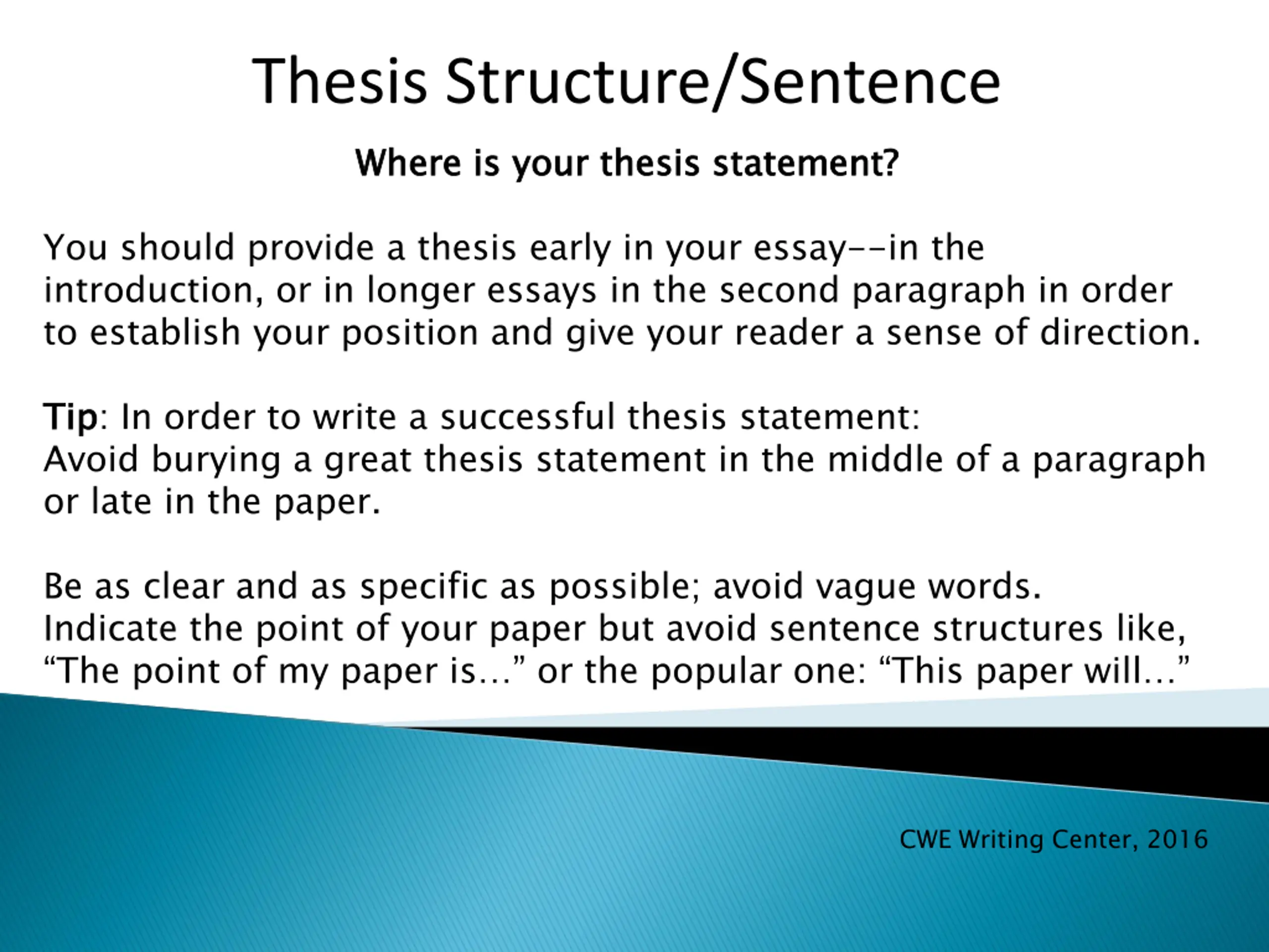 Thesis Structure/Sentence Where is your thesis statement? Where is your thesis statement? You should provide a thesis early in your essay--in the introduction, or in longer essays in the second paragraph in order to establish your position and give your reader a sense of direction. Tip Avoid burying a great thesis statement in the middle of a paragraph or late in the paper. Tip: In order to write a successful thesis statement: Be as clear and as specific as possible; avoid vague words. Indicate the point of your paper but avoid sentence structures like, The point of my paper is or the popular one: This paper will CWE Writing Center, 2016