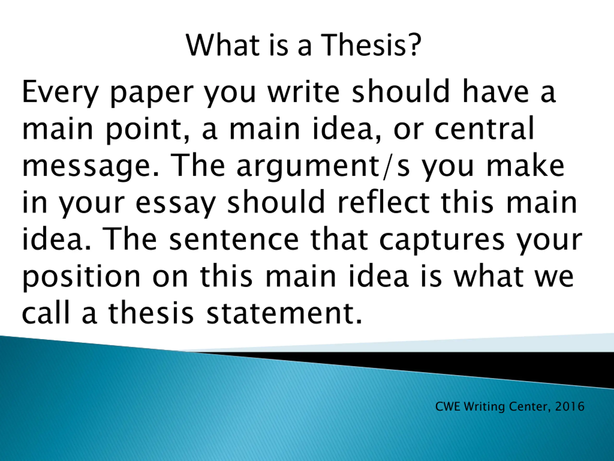 What is a Thesis? Every paper you write should have a main point, a main idea, or central message. The argument/s you make in your essay should reflect this main idea. The sentence that captures your position on this main idea is what we call a thesis statement. CWE Writing Center, 2016
