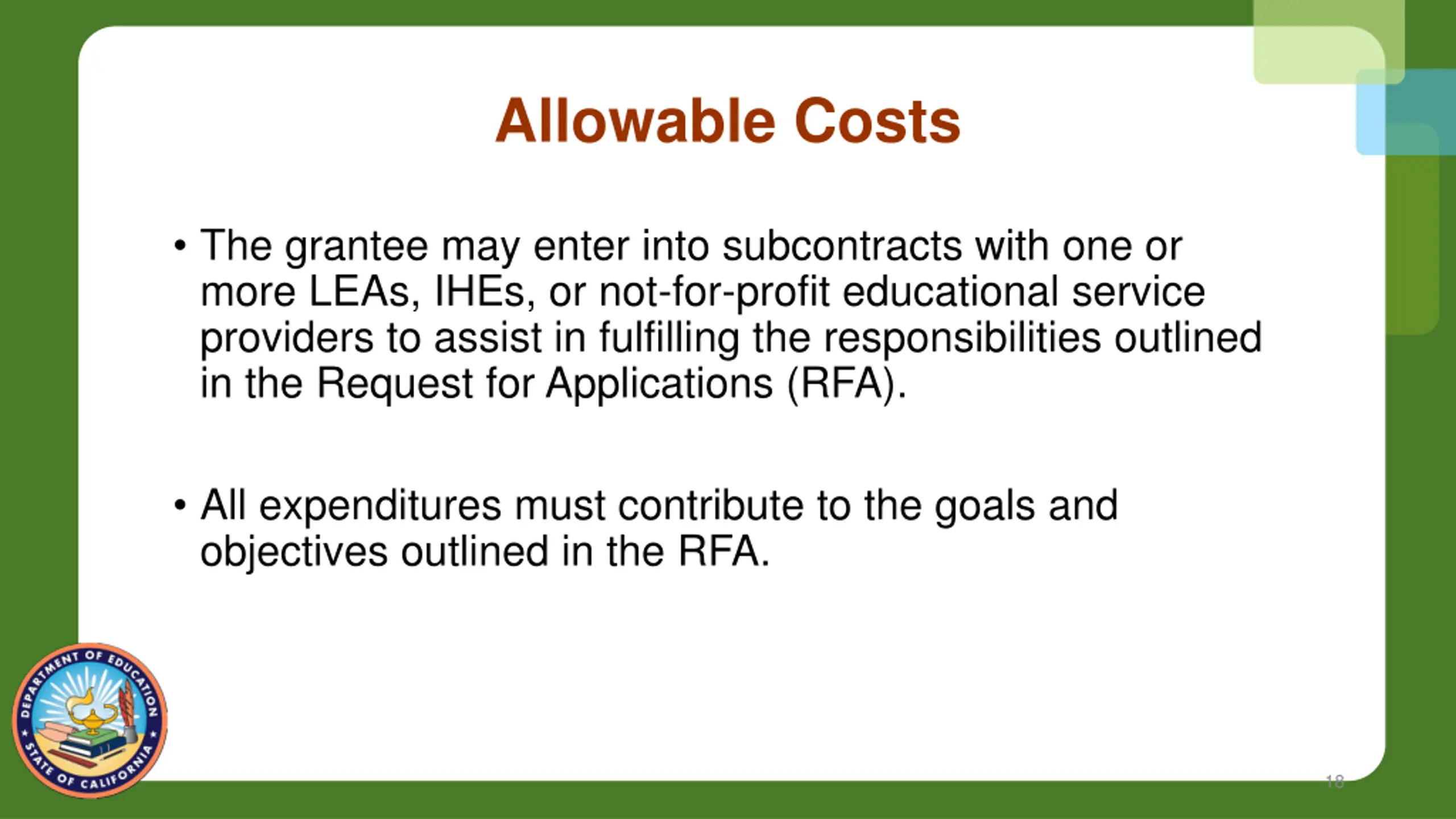Allowable Costs The grantee may enter into subcontracts with one or more LEAs, IHEs, or not-for-profit educational service providers to assist in fulfilling the responsibilities outlined in the Request for Applications (RFA). All expenditures must contribute to the goals and objectives outlined in the RFA. 18