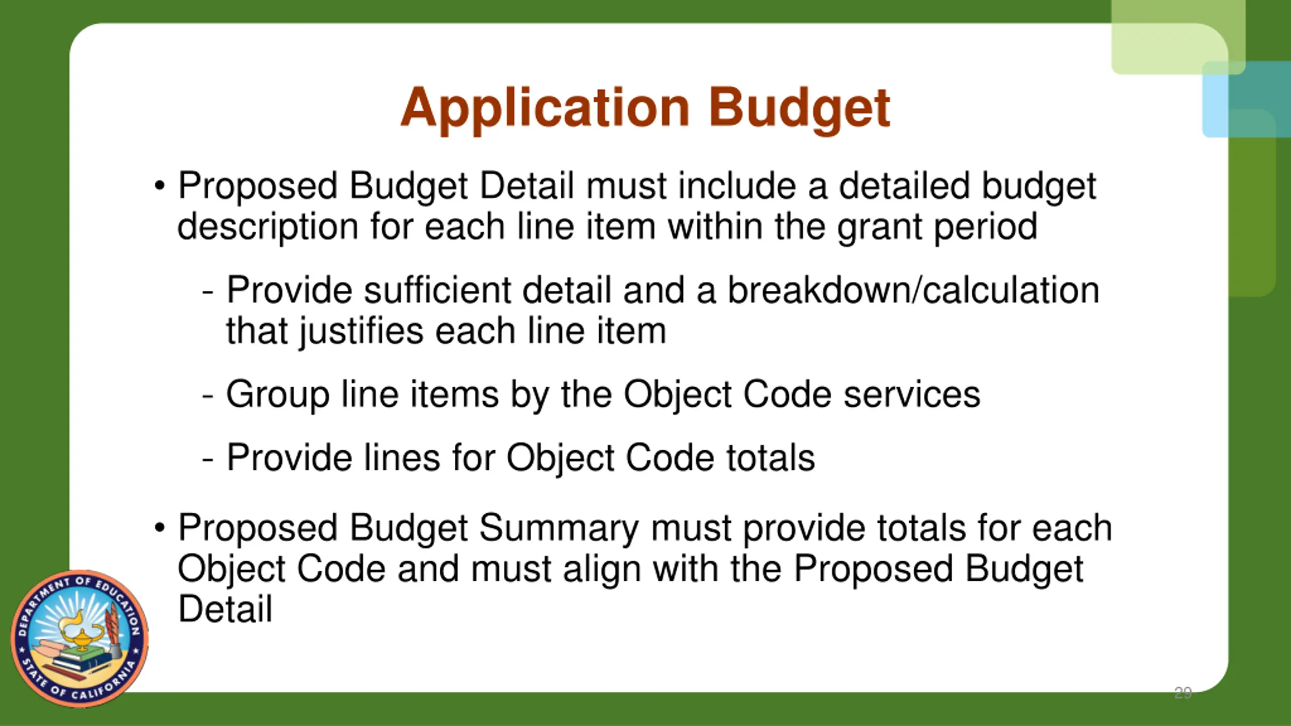 Application Budget Proposed Budget Detail must include a detailed budget description for each line item within the grant period - Provide sufficient detail and a breakdown/calculation that justifies each line item - Group line items by the Object Code services - Provide lines for Object Code totals Proposed Budget Summary must provide totals for each Object Code and must align with the Proposed Budget Detail 29
