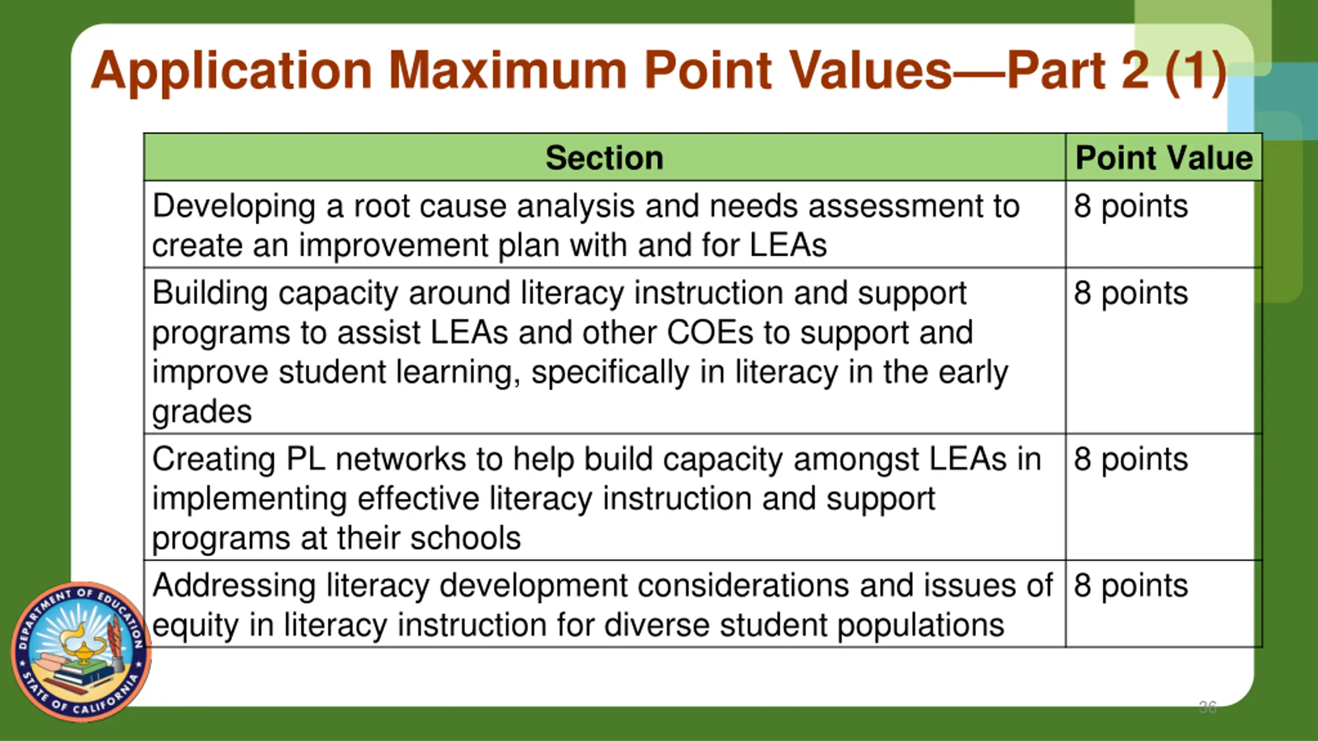 Application Maximum Point ValuesPart 2 (1) Section Point Value 8 points Developing a root cause analysis and needs assessment to create an improvement plan with and for LEAs Building capacity around literacy instruction and support programs to assist LEAs and other COEs to support and improve student learning, specifically in literacy in the early grades Creating PL networks to help build capacity amongst LEAs in implementing effective literacy instruction and support programs at their schools Addressing literacy development considerations and issues of equity in literacy instruction for diverse student populations 8 points 8 points 8 points 36