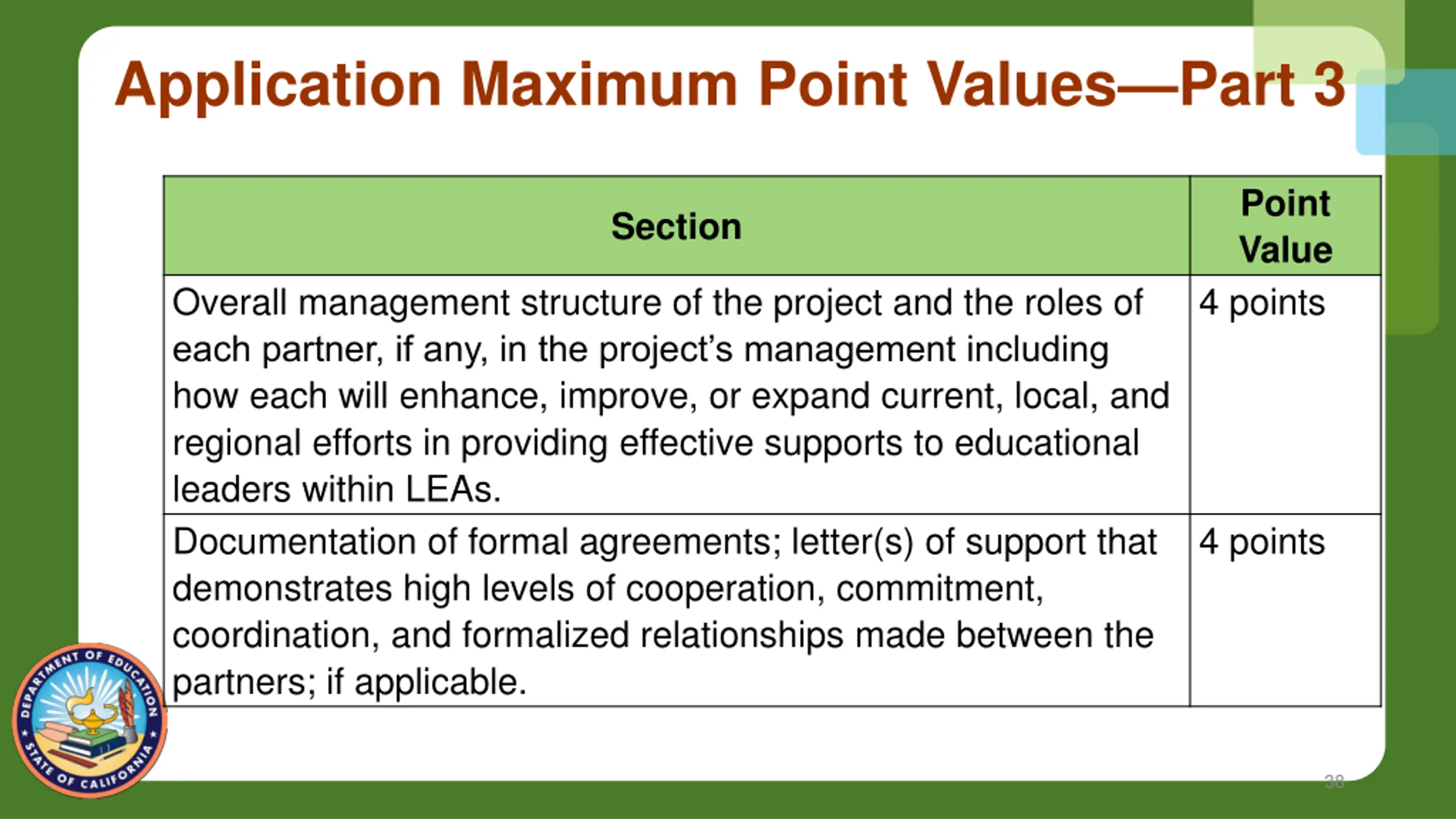 Application Maximum Point ValuesPart 3 Point Value 4 points Section Overall management structure of the project and the roles of each partner, if any, in the project s management including how each will enhance, improve, or expand current, local, and regional efforts in providing effective supports to educational leaders within LEAs. Documentation of formal agreements; letter(s) of support that demonstrates high levels of cooperation, commitment, coordination, and formalized relationships made between the partners; if applicable. 4 points 38