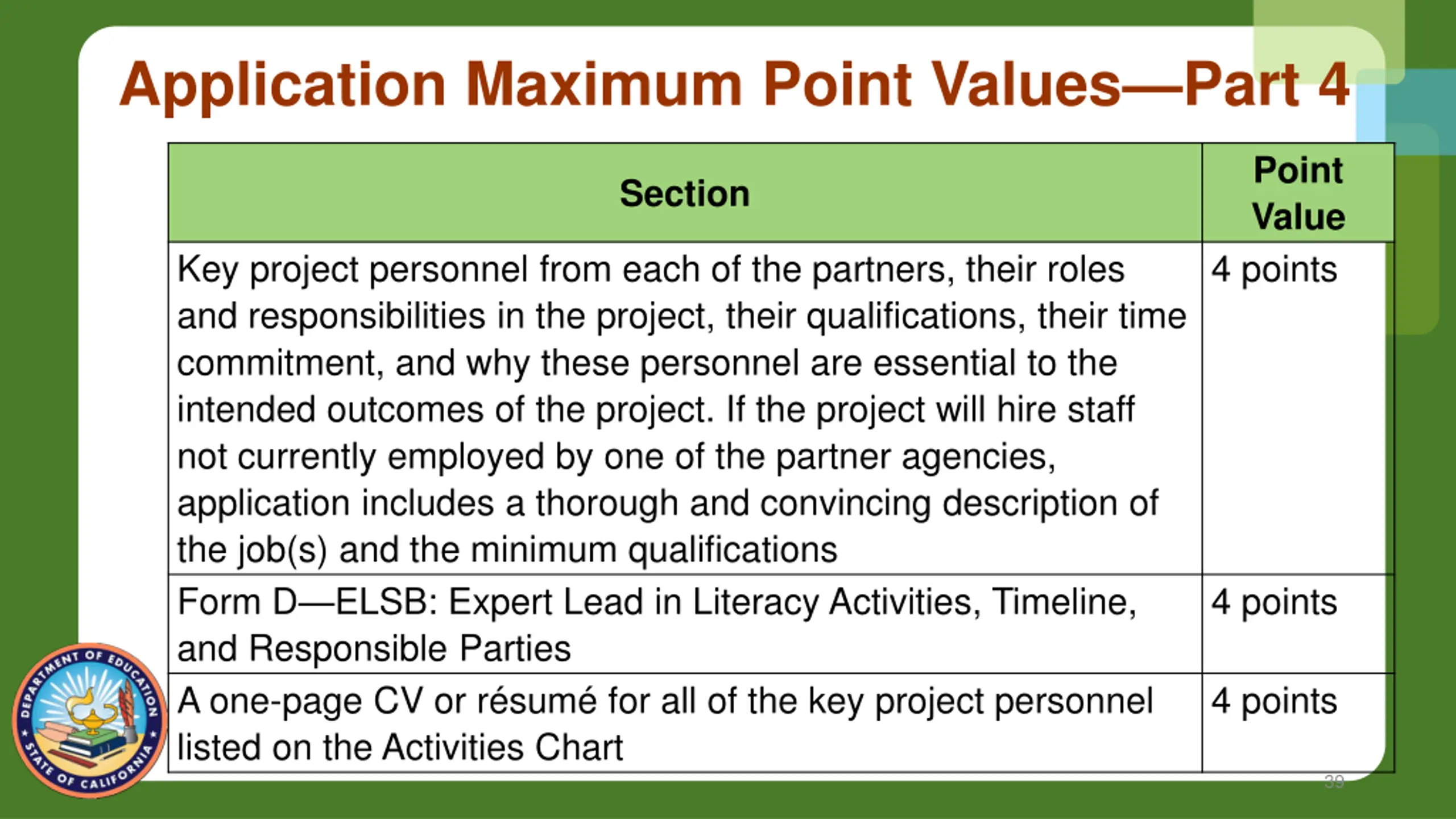 Application Maximum Point ValuesPart 4 Point Value 4 points Section Key project personnel from each of the partners, their roles and responsibilities in the project, their qualifications, their time commitment, and why these personnel are essential to the intended outcomes of the project. If the project will hire staff not currently employed by one of the partner agencies, application includes a thorough and convincing description of the job(s) and the minimum qualifications Form D ELSB: Expert Lead in Literacy Activities, Timeline, and Responsible Parties A one-page CV or r sum for all of the key project personnel listed on the Activities Chart 4 points 4 points 39