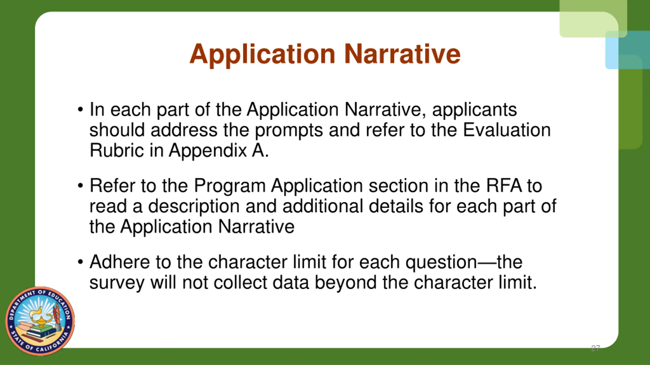 Application Narrative In each part of the Application Narrative, applicants should address the prompts and refer to the Evaluation Rubric in Appendix A. Refer to the Program Application section in the RFA to read a description and additional details for each part of the Application Narrative Adhere to the character limit for each question the survey will not collect data beyond the character limit. 27