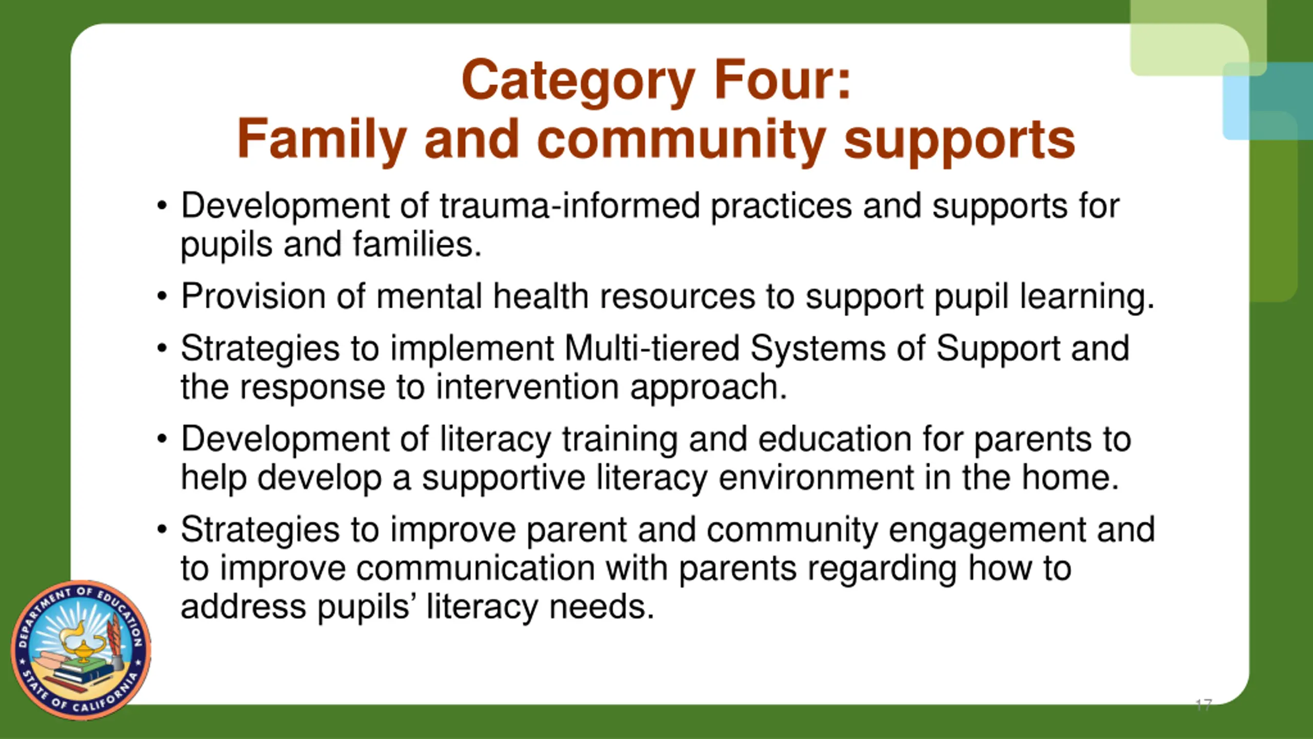 Category Four: Family and community supports Development of trauma-informed practices and supports for pupils and families. Provision of mental health resources to support pupil learning. Strategies to implement Multi-tiered Systems of Support and the response to intervention approach. Development of literacy training and education for parents to help develop a supportive literacy environment in the home. Strategies to improve parent and community engagement and to improve communication with parents regarding how to address pupils literacy needs. 17