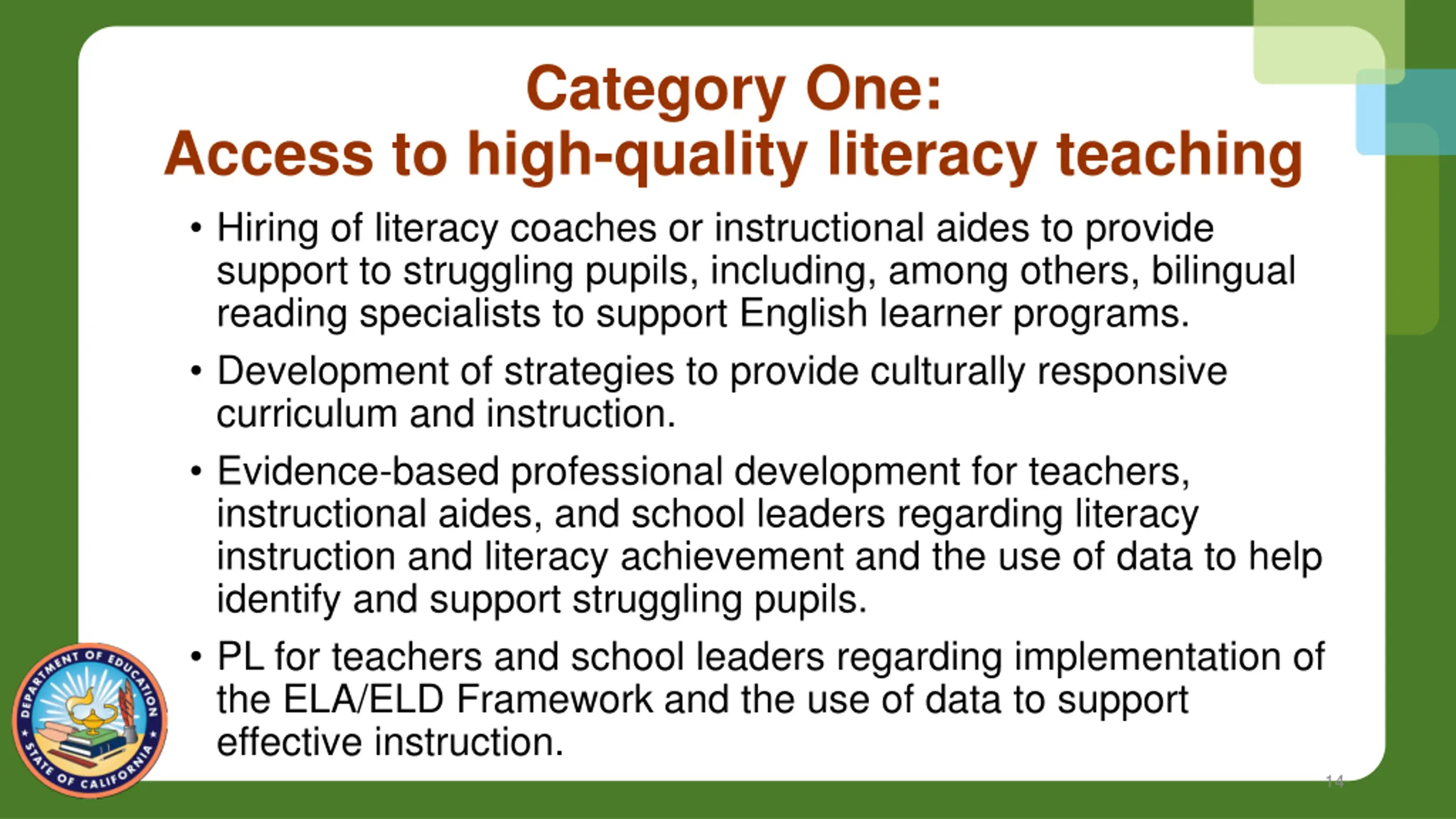 Category One: Access to high-quality literacy teaching Hiring of literacy coaches or instructional aides to provide support to struggling pupils, including, among others, bilingual reading specialists to support English learner programs. Development of strategies to provide culturally responsive curriculum and instruction. Evidence-based professional development for teachers, instructional aides, and school leaders regarding literacy instruction and literacy achievement and the use of data to help identify and support struggling pupils. PL for teachers and school leaders regarding implementation of the ELA/ELD Framework and the use of data to support effective instruction. 14