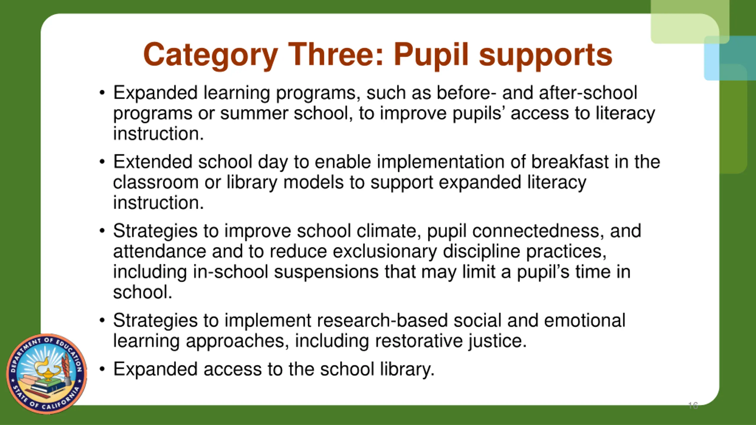 Category Three: Pupil supports Expanded learning programs, such as before- and after-school programs or summer school, to improve pupils access to literacy instruction. Extended school day to enable implementation of breakfast in the classroom or library models to support expanded literacy instruction. Strategies to improve school climate, pupil connectedness, and attendance and to reduce exclusionary discipline practices, including in-school suspensions that may limit a pupil s time in school. Strategies to implement research-based social and emotional learning approaches, including restorative justice. Expanded access to the school library. 16