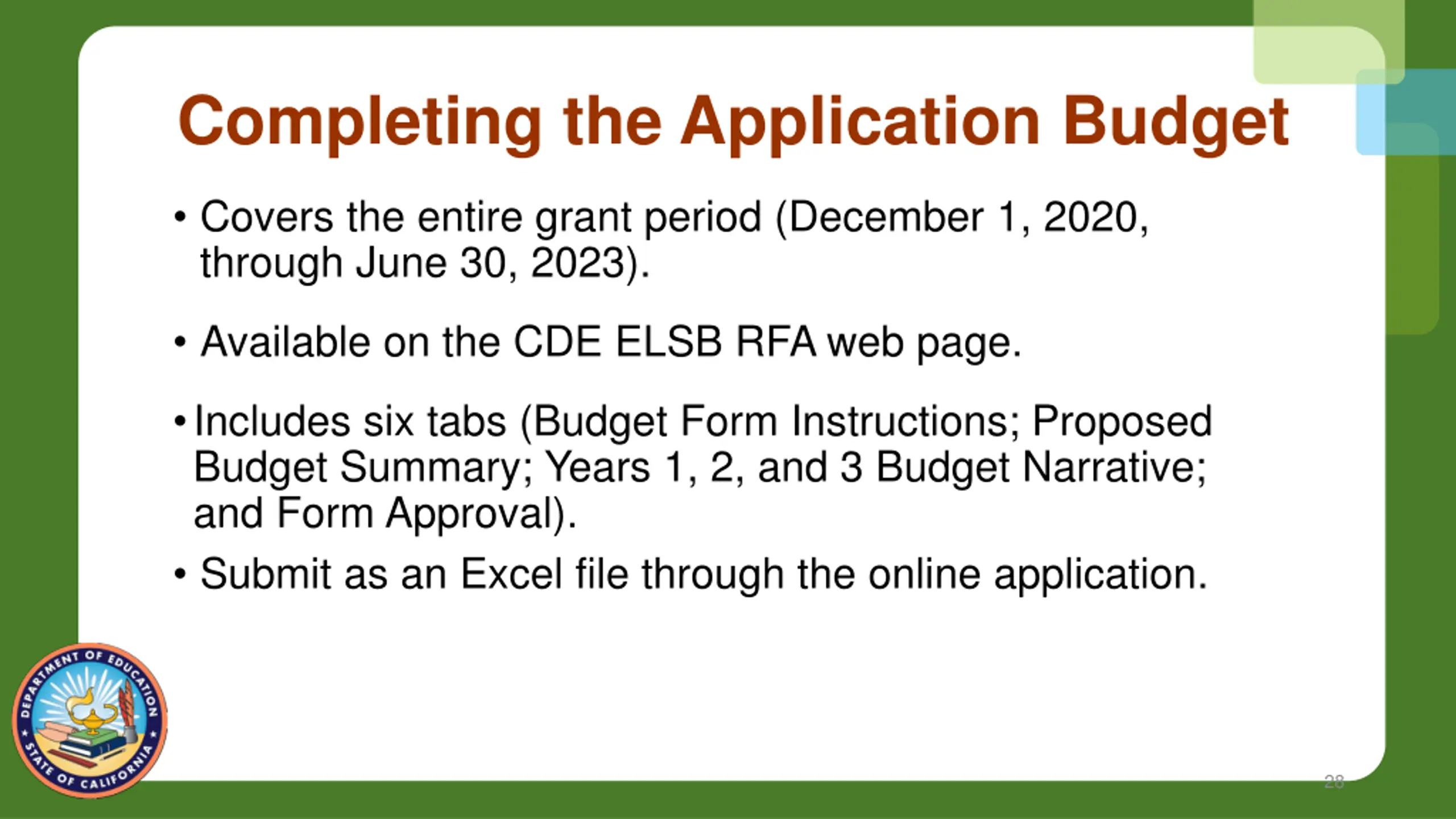 Completing the Application Budget Covers the entire grant period (December 1, 2020, through June 30, 2023). Available on the CDE ELSB RFA web page. Includes six tabs (Budget Form Instructions; Proposed Budget Summary; Years 1, 2, and 3 Budget Narrative; and Form Approval). Submit as an Excel file through the online application. 28