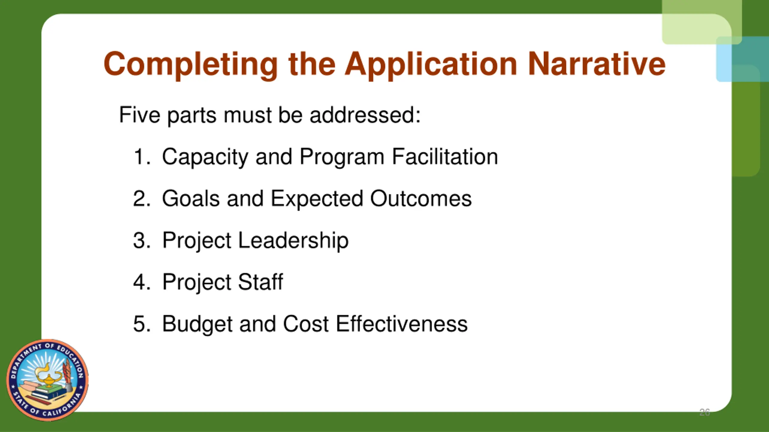 Completing the Application Narrative Five parts must be addressed: 1. Capacity and Program Facilitation 2. Goals and Expected Outcomes 3. Project Leadership 4. Project Staff 5. Budget and Cost Effectiveness 26