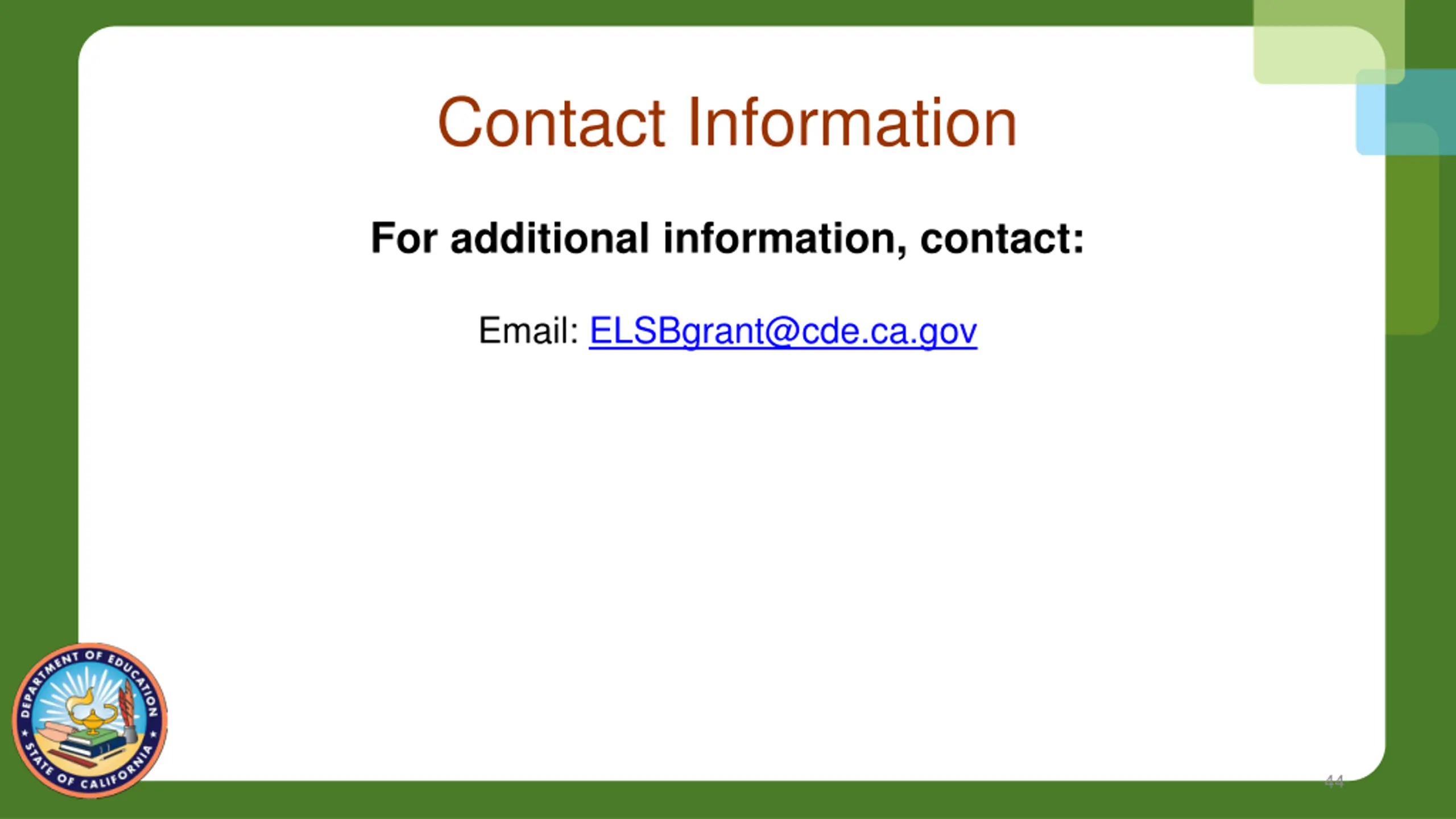 Contact Information For additional information, contact: Email: ELSBgrant@cde.ca.gov 44
