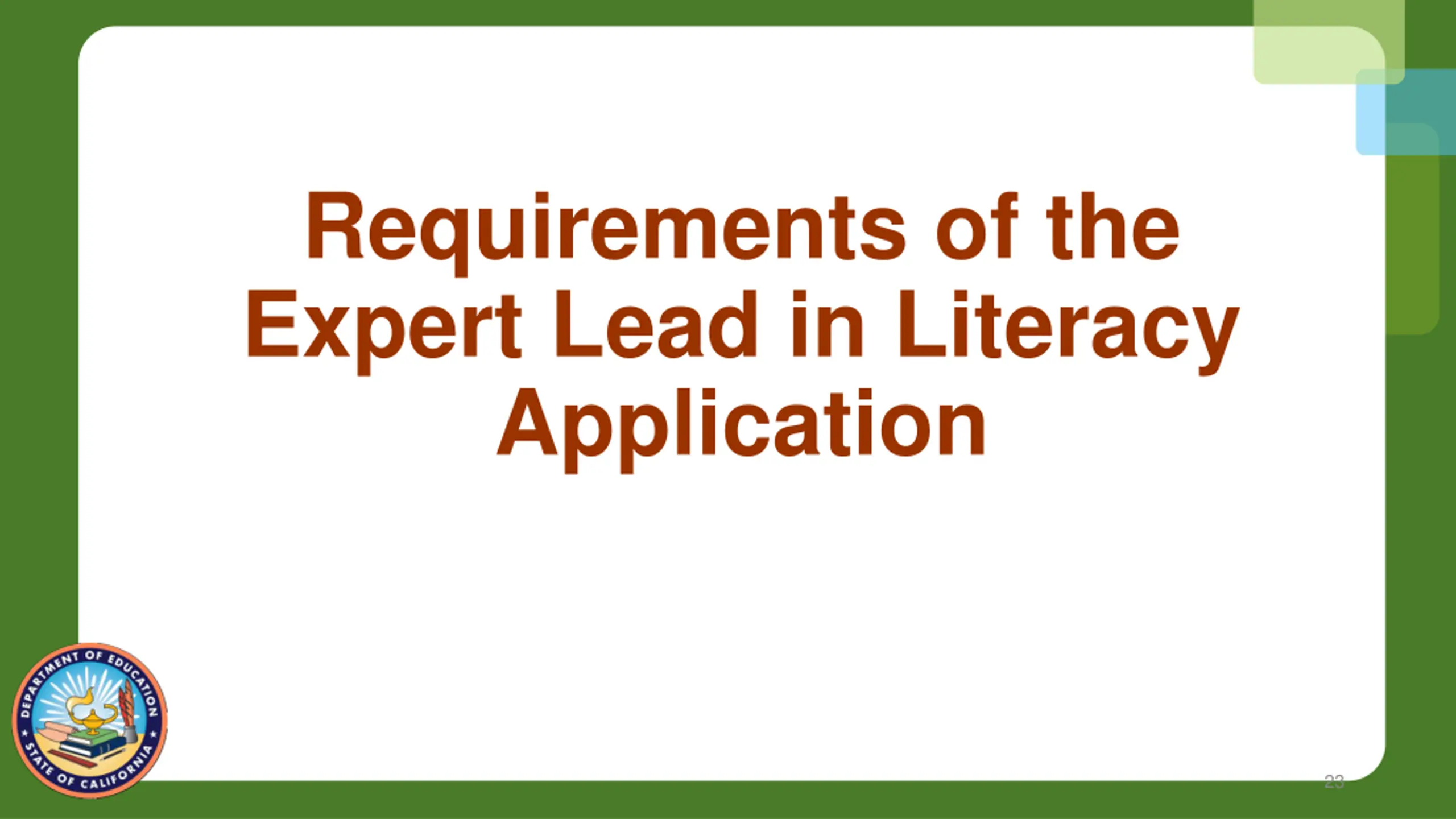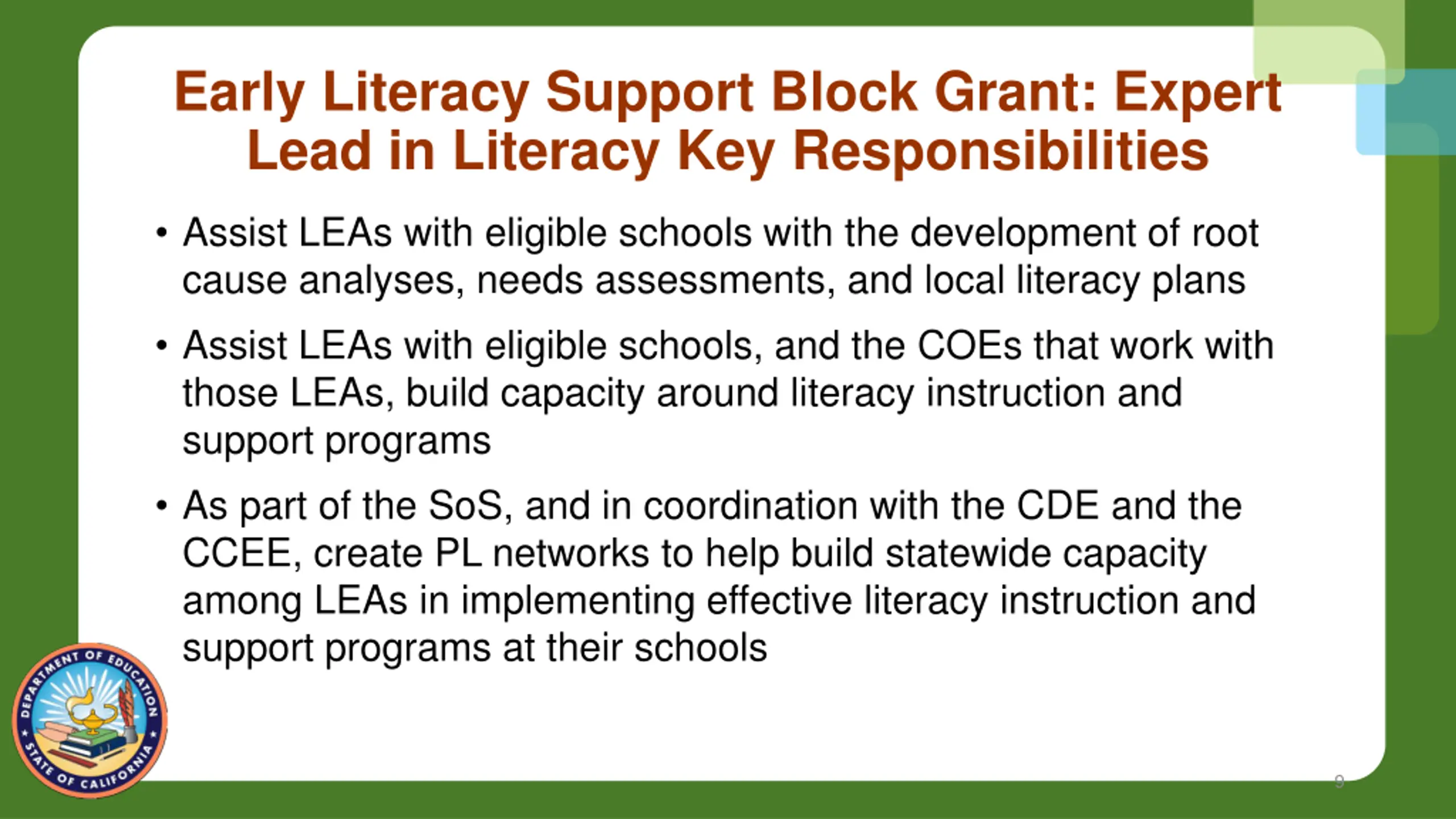 Early Literacy Support Block Grant: Expert Lead in Literacy Qualifications Demonstrate abilities and expertise developing, implementing, and supporting other LEAs and their schools with literacy instruction and support programs, particularly focused on literacy in early grades (kindergarten, which includes transitional kindergarten, and grades one through three) Demonstrate expertise in the four categories of programs and services specified in SB 98, Section 113(e): access to high- quality literacy teaching, support for literacy learning, pupil supports, and family and community supports 8