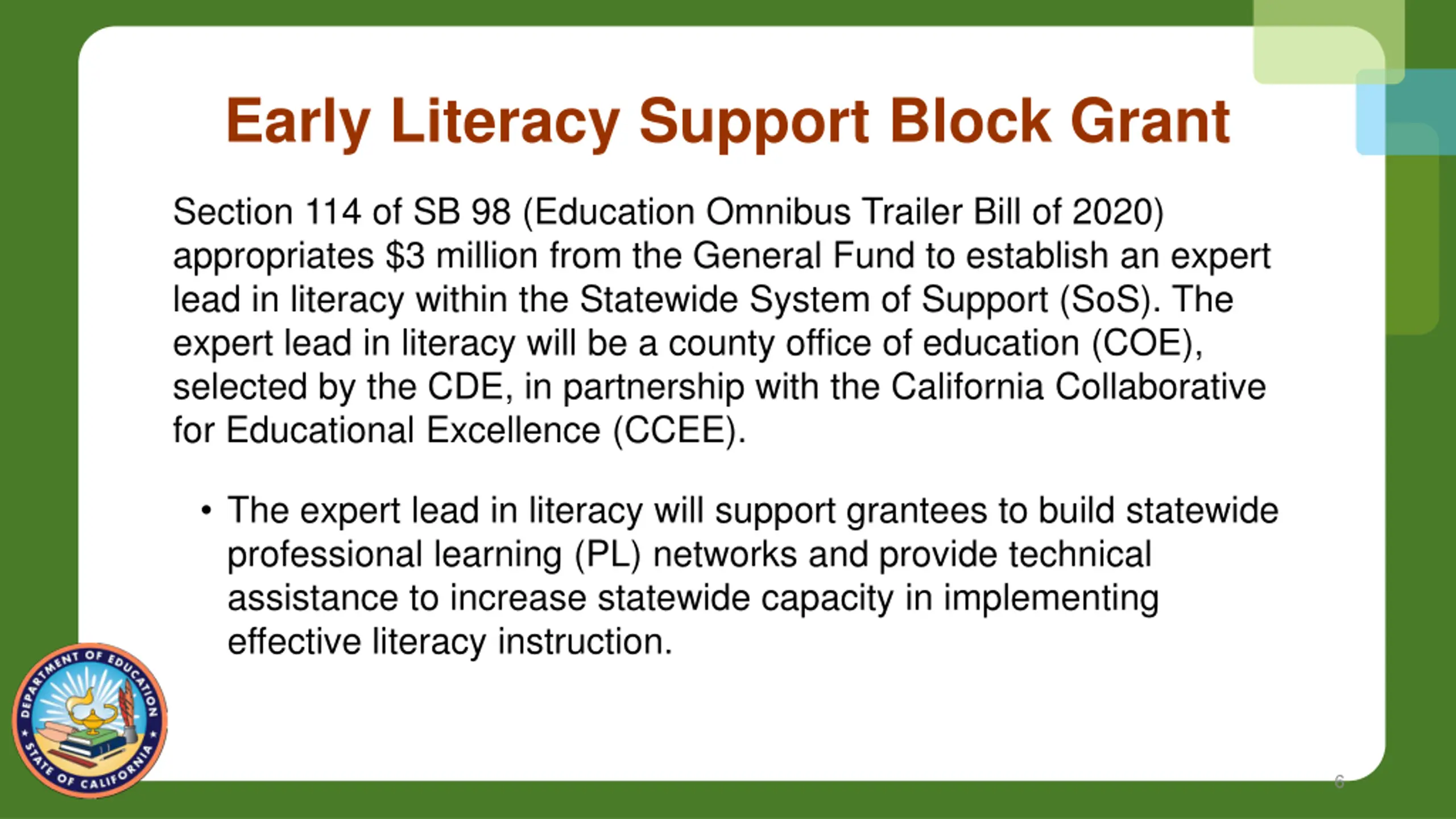 Early Literacy Support Block Grant Section 114 of SB 98 (Education Omnibus Trailer Bill of 2020) appropriates $3 million from the General Fund to establish an expert lead in literacy within the Statewide System of Support (SoS). The expert lead in literacy will be a county office of education (COE), selected by the CDE, in partnership with the California Collaborative for Educational Excellence (CCEE). The expert lead in literacy will support grantees to build statewide professional learning (PL) networks and provide technical assistance to increase statewide capacity in implementing effective literacy instruction. 6