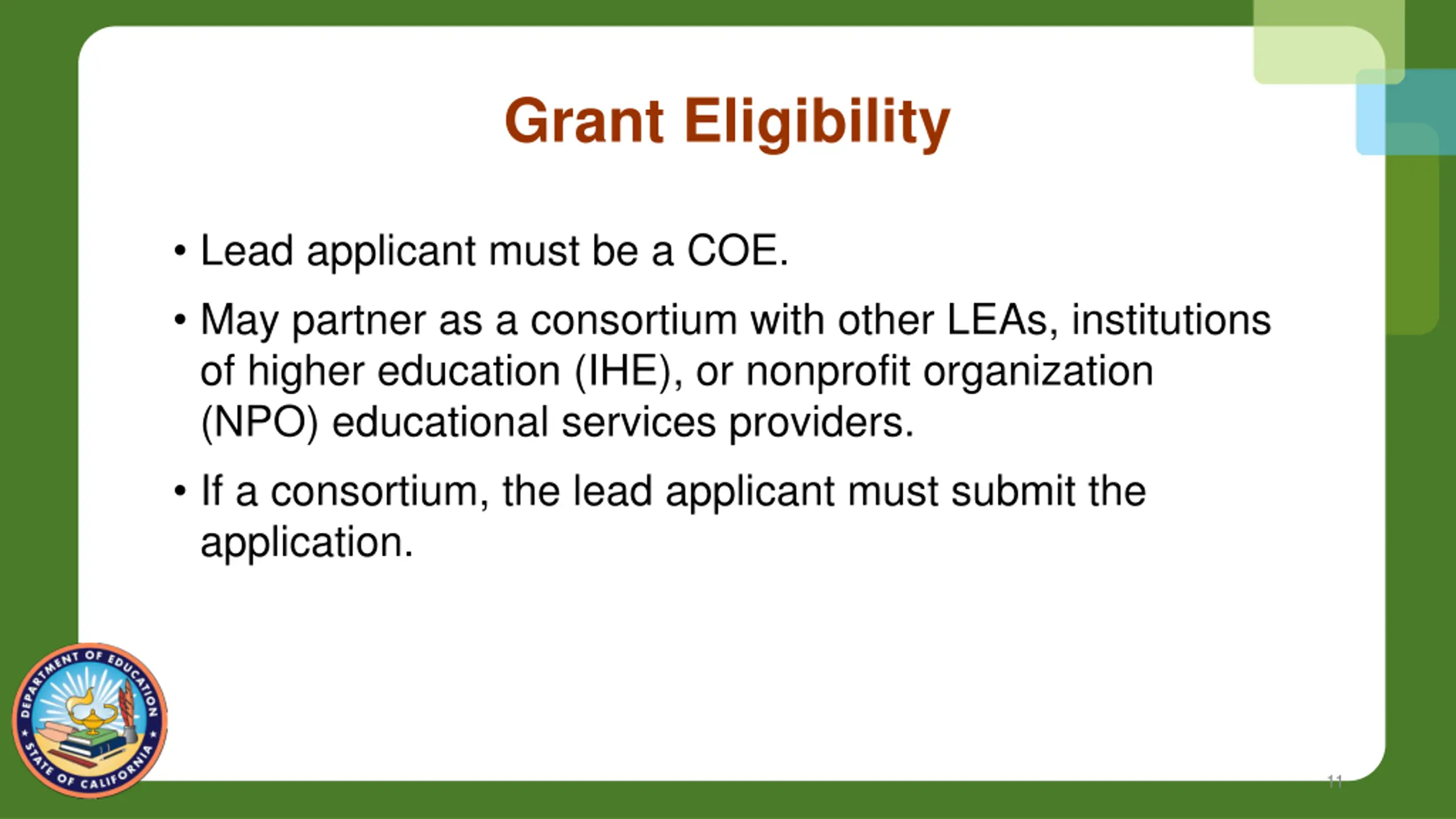 Grant Eligibility Lead applicant must be a COE. May partner as a consortium with other LEAs, institutions of higher education (IHE), or nonprofit organization (NPO) educational services providers. If a consortium, the lead applicant must submit the application. 11