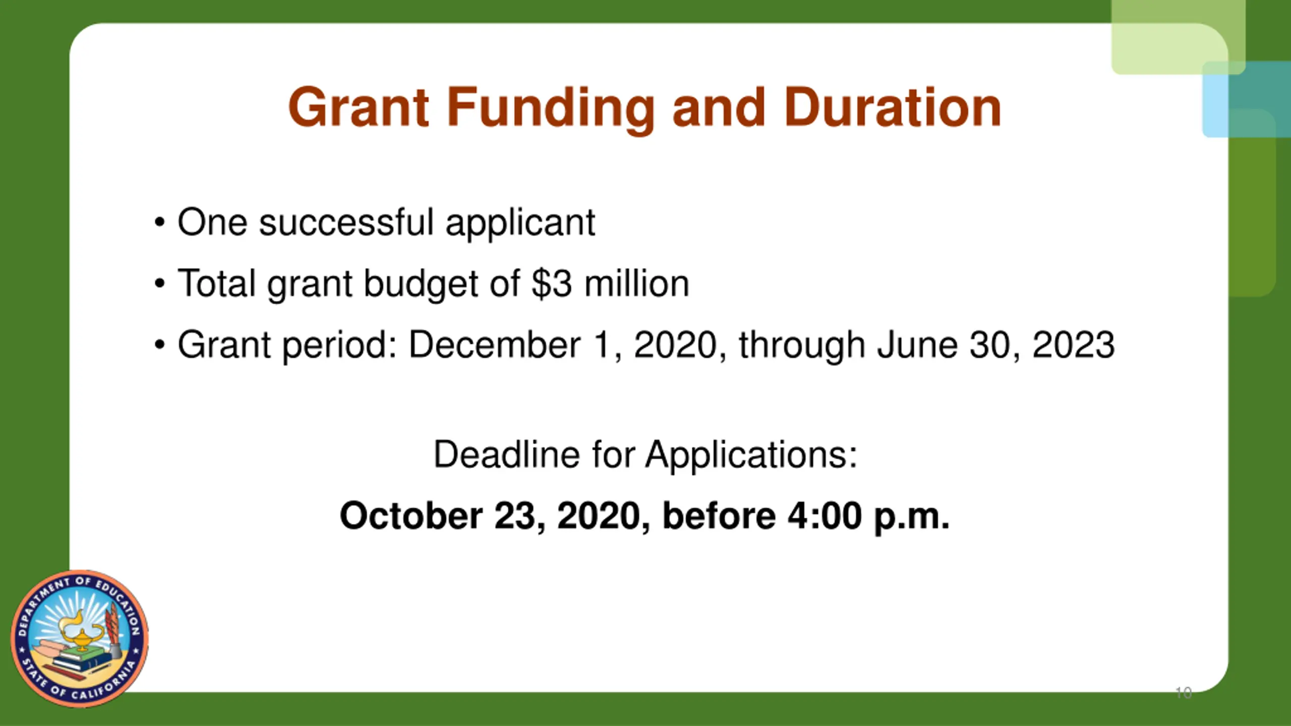 Grant Funding and Duration One successful applicant Total grant budget of $3 million Grant period: December 1, 2020, through June 30, 2023 Deadline for Applications: October 23, 2020, before 4:00 p.m. 10