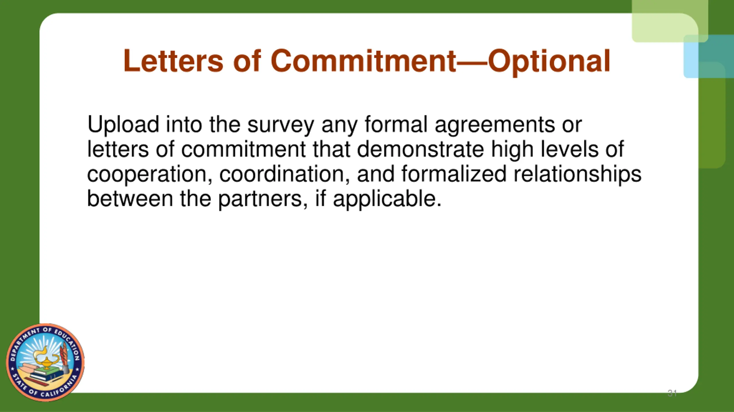 Letters of CommitmentOptional Upload into the survey any formal agreements or letters of commitment that demonstrate high levels of cooperation, coordination, and formalized relationships between the partners, if applicable. 31