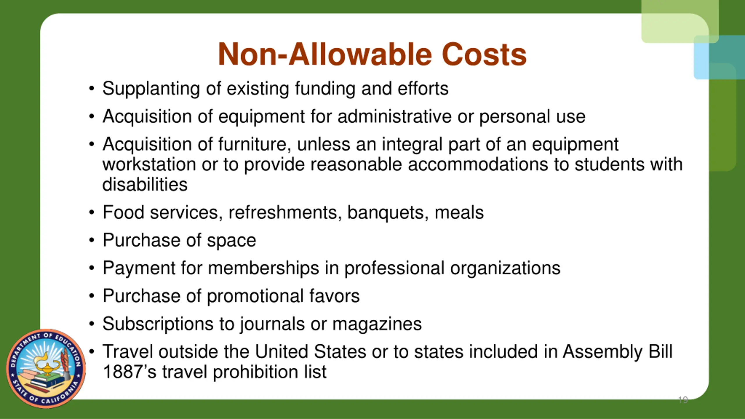 Non-Allowable Costs Supplanting of existing funding and efforts Acquisition of equipment for administrative or personal use Acquisition of furniture, unless an integral part of an equipment workstation or to provide reasonable accommodations to students with disabilities Food services, refreshments, banquets, meals Purchase of space Payment for memberships in professional organizations Purchase of promotional favors Subscriptions to journals or magazines Travel outside the United States or to states included in Assembly Bill 1887 s travel prohibition list 19