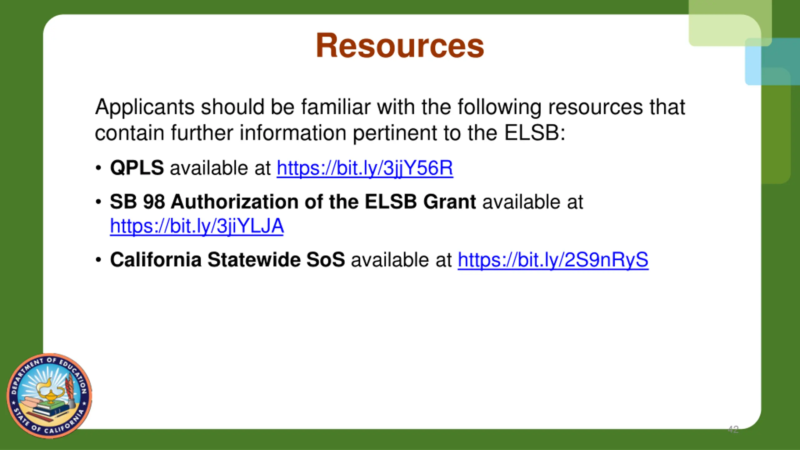 Resources Applicants should be familiar with the following resources that contain further information pertinent to the ELSB: QPLS available at https://bit.ly/3jjY56R SB 98 Authorization of the ELSB Grant available at https://bit.ly/3jiYLJA California Statewide SoS available at https://bit.ly/2S9nRyS 42