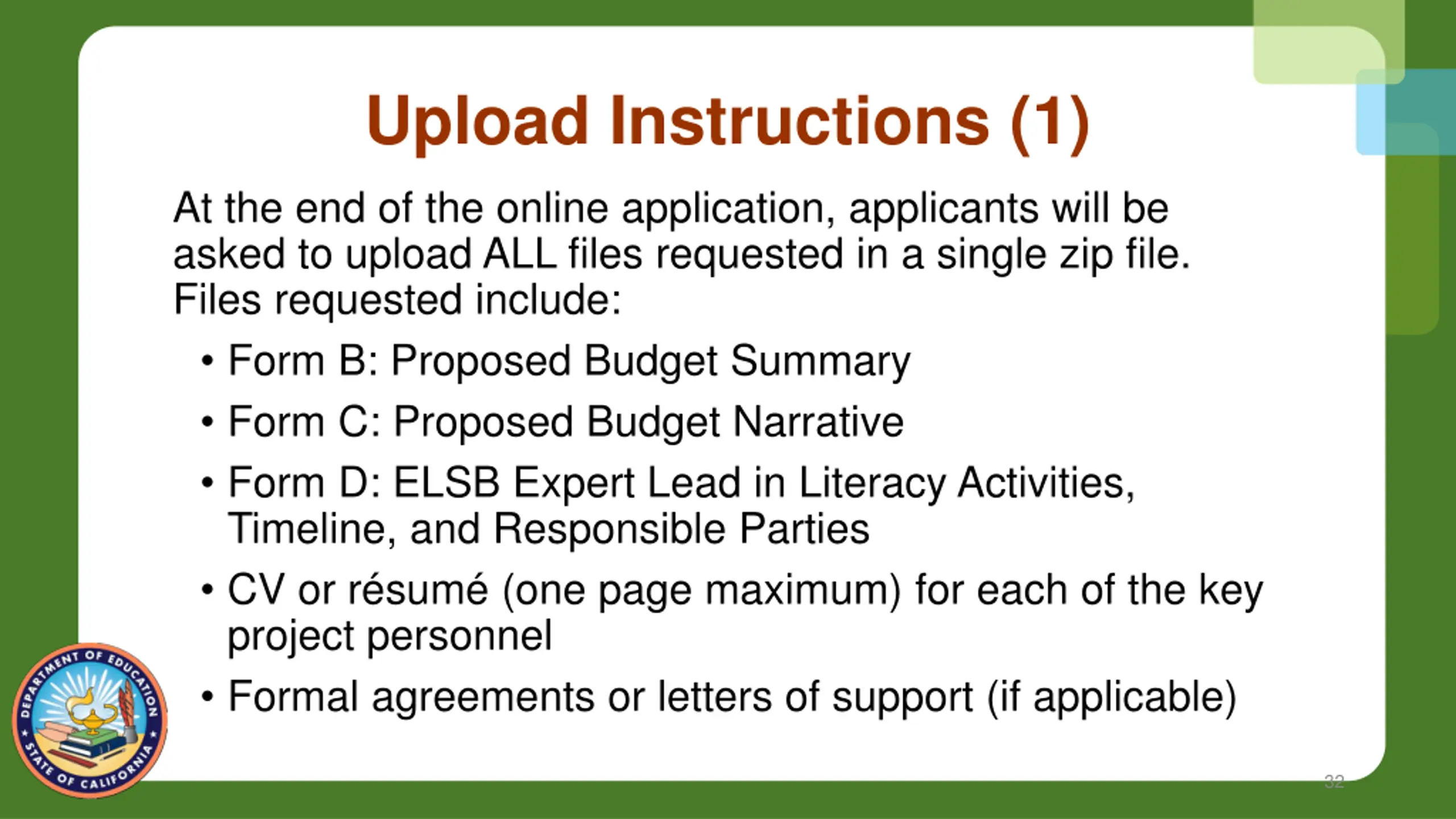 Upload Instructions (1) At the end of the online application, applicants will be asked to upload ALL files requested in a single zip file. Files requested include: Form B: Proposed Budget Summary Form C: Proposed Budget Narrative Form D: ELSB Expert Lead in Literacy Activities, Timeline, and Responsible Parties CV or r sum (one page maximum) for each of the key project personnel Formal agreements or letters of support (if applicable) 32