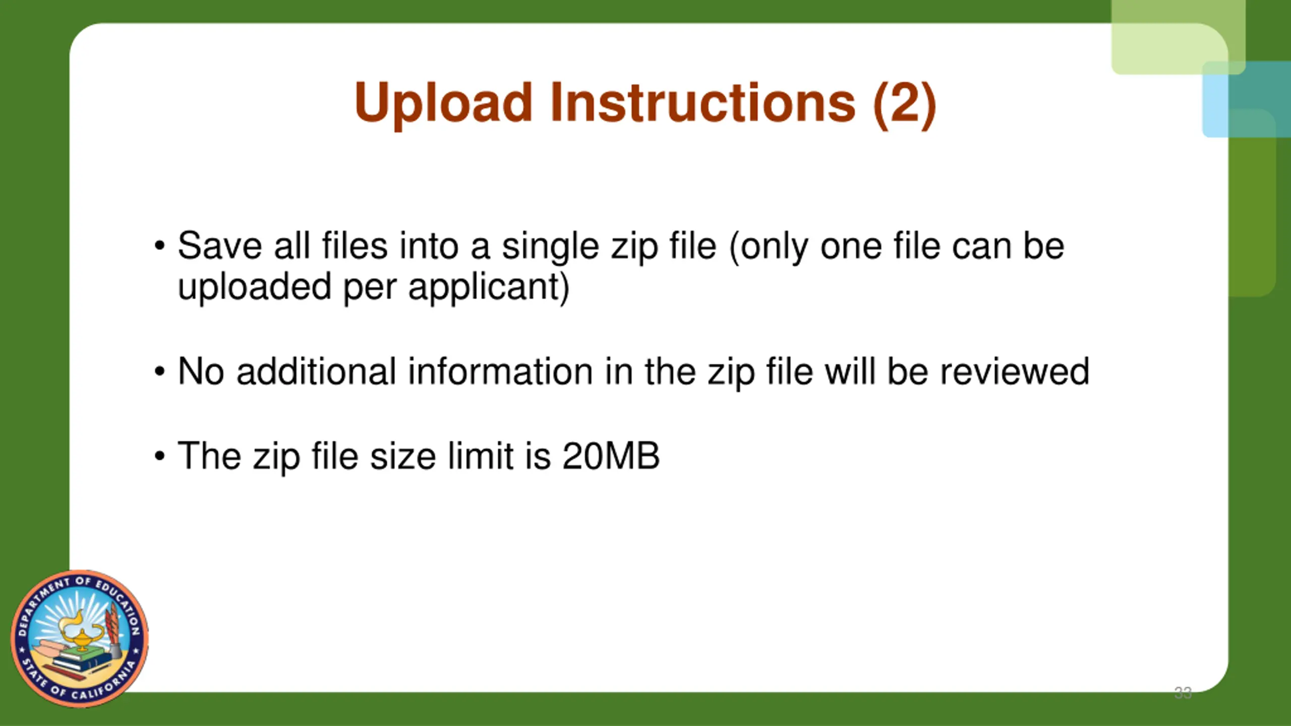 Upload Instructions (2) Save all files into a single zip file (only one file can be uploaded per applicant) No additional information in the zip file will be reviewed The zip file size limit is 20MB 33