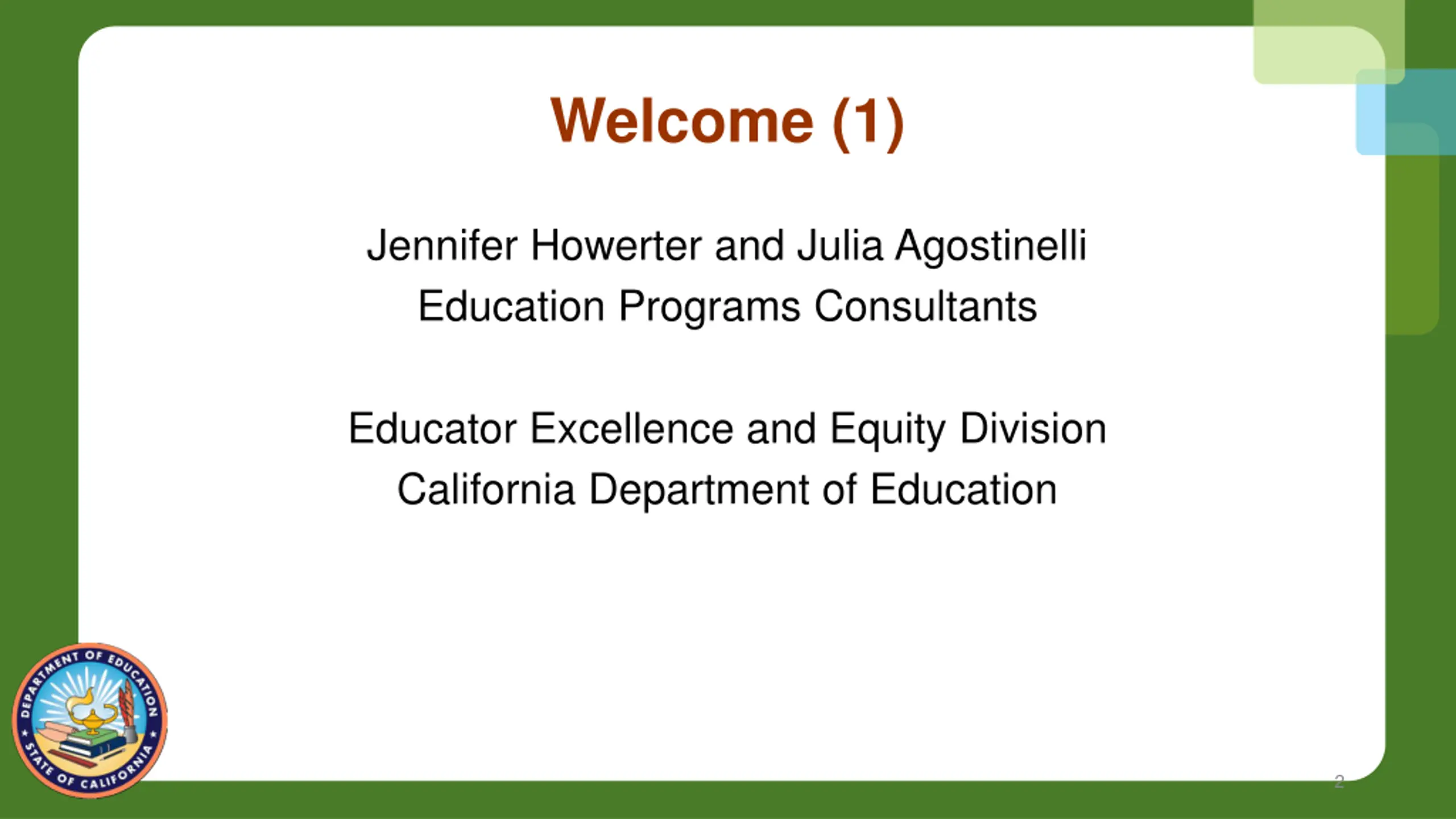 Welcome (1) Jennifer Howerter and Julia Agostinelli Education Programs Consultants Educator Excellence and Equity Division California Department of Education 2