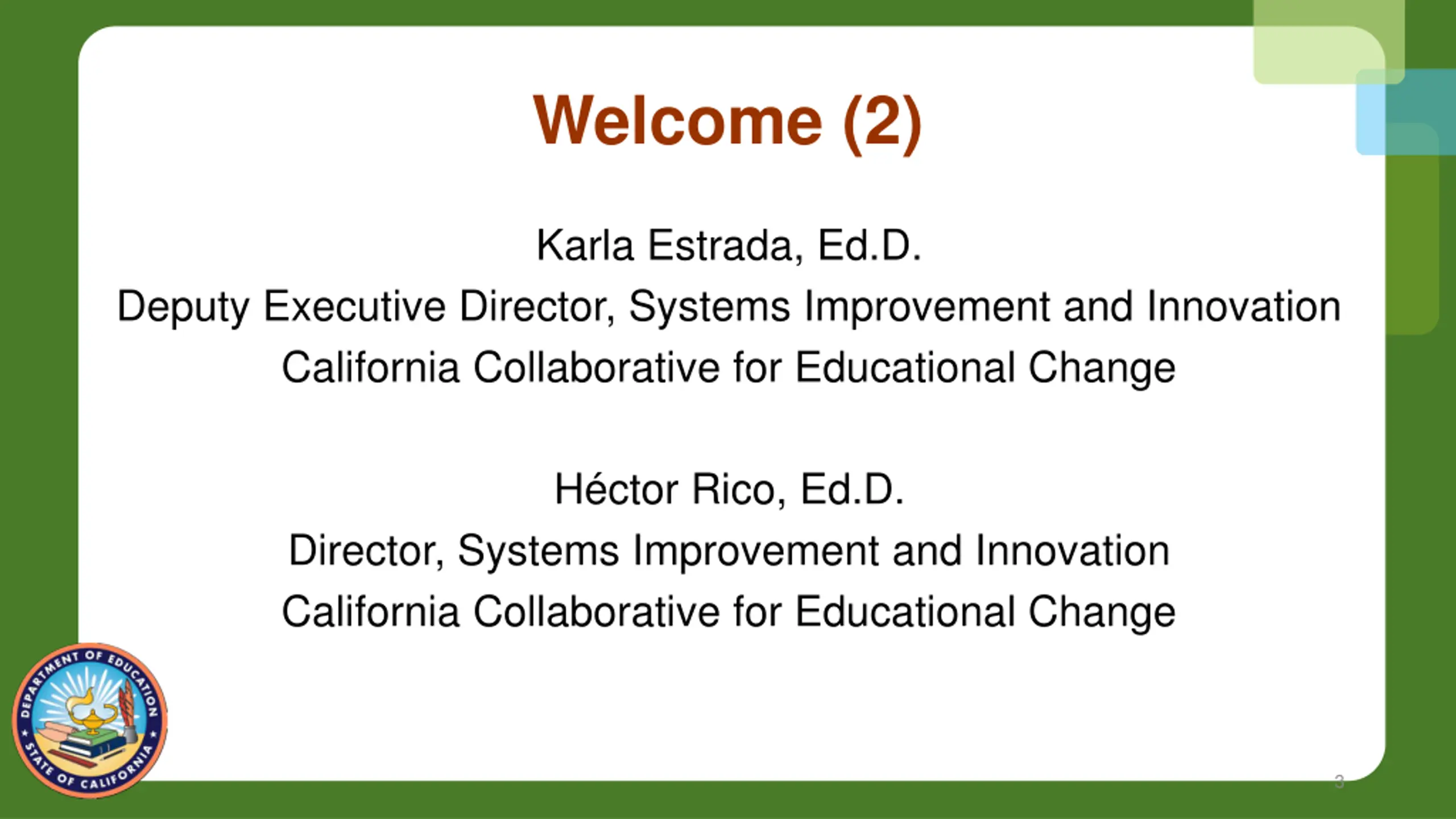 Welcome (2) Karla Estrada, Ed.D. Deputy Executive Director, Systems Improvement and Innovation California Collaborative for Educational Change H ctor Rico, Ed.D. Director, Systems Improvement and Innovation California Collaborative for Educational Change 3
