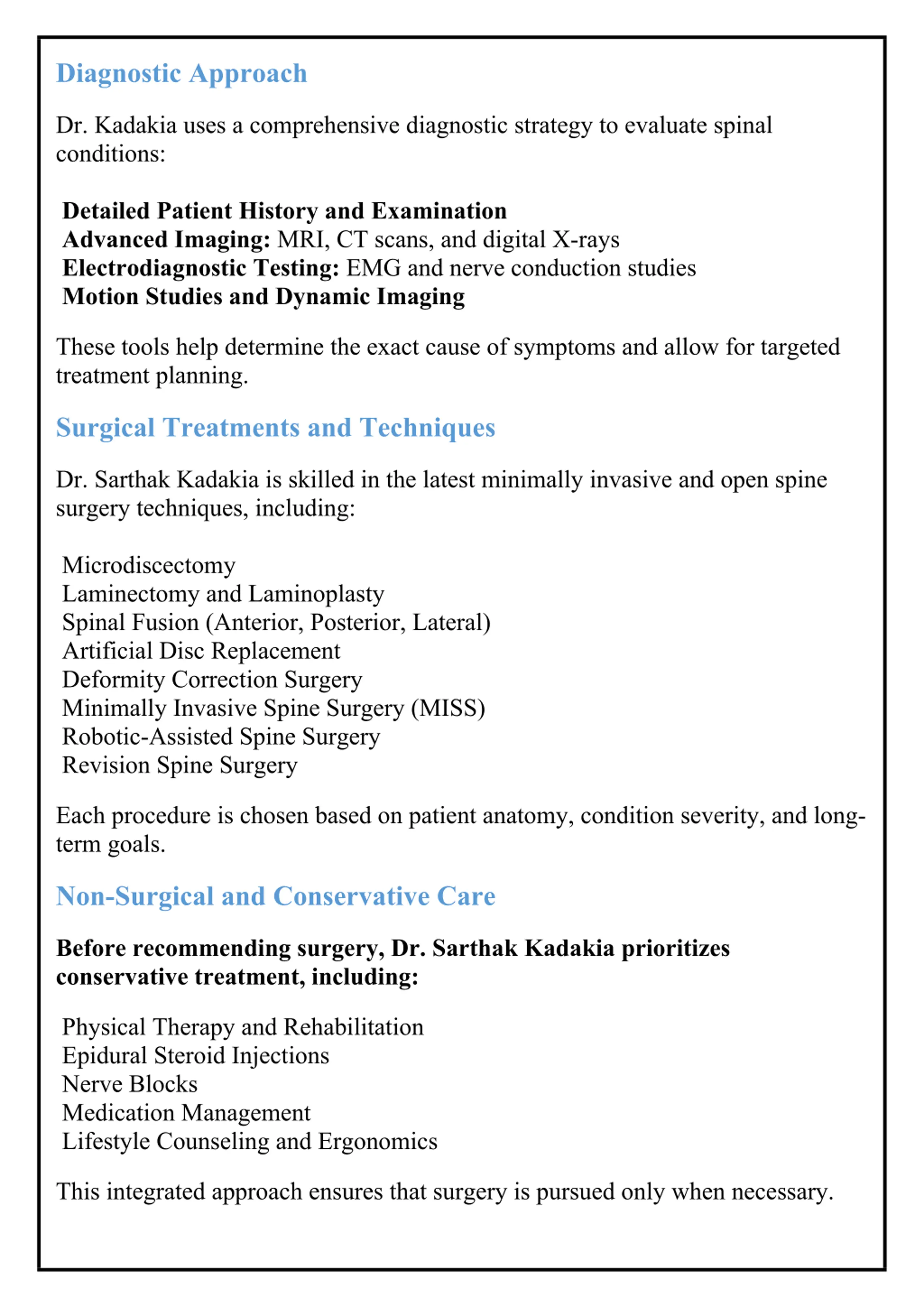 Diagnostic Approach Dr. Kadakia uses a comprehensive diagnostic strategy to evaluate spinal conditions: Detailed Patient History and Examination Advanced Imaging: MRI, CT scans, and digital X-rays Electrodiagnostic Testing: EMG and nerve conduction studies Motion Studies and Dynamic Imaging These tools help determine the exact cause of symptoms and allow for targeted treatment planning. Surgical Treatments and Techniques Dr. Sarthak Kadakia is skilled in the latest minimally invasive and open spine surgery techniques, including: Microdiscectomy Laminectomy and Laminoplasty Spinal Fusion (Anterior, Posterior, Lateral) Artificial Disc Replacement Deformity Correction Surgery Minimally Invasive Spine Surgery (MISS) Robotic-Assisted Spine Surgery Revision Spine Surgery Each procedure is chosen based on patient anatomy, condition severity, and long- term goals. Non-Surgical and Conservative Care Before recommending surgery, Dr. Sarthak Kadakia prioritizes conservative treatment, including: Physical Therapy and Rehabilitation Epidural Steroid Injections Nerve Blocks Medication Management Lifestyle Counseling and Ergonomics This integrated approach ensures that surgery is pursued only when necessary.