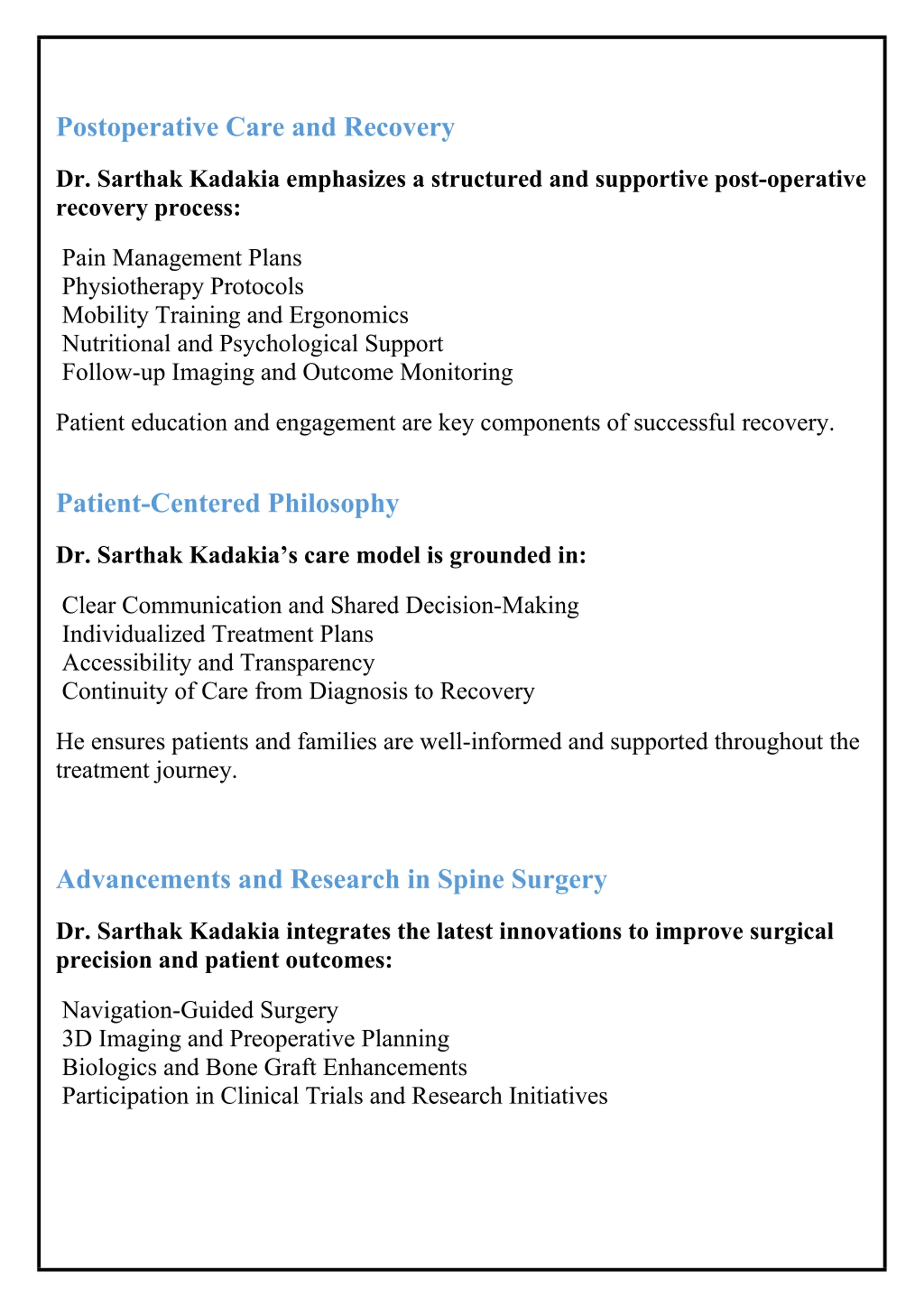 Postoperative Care and Recovery Dr. Sarthak Kadakia emphasizes a structured and supportive post-operative recovery process: Pain Management Plans Physiotherapy Protocols Mobility Training and Ergonomics Nutritional and Psychological Support Follow-up Imaging and Outcome Monitoring Patient education and engagement are key components of successful recovery. Patient-Centered Philosophy Dr. Sarthak Kadakia s care model is grounded in: Clear Communication and Shared Decision-Making Individualized Treatment Plans Accessibility and Transparency Continuity of Care from Diagnosis to Recovery He ensures patients and families are well-informed and supported throughout the treatment journey. Advancements and Research in Spine Surgery Dr. Sarthak Kadakia integrates the latest innovations to improve surgical precision and patient outcomes: Navigation-Guided Surgery 3D Imaging and Preoperative Planning Biologics and Bone Graft Enhancements Participation in Clinical Trials and Research Initiatives
