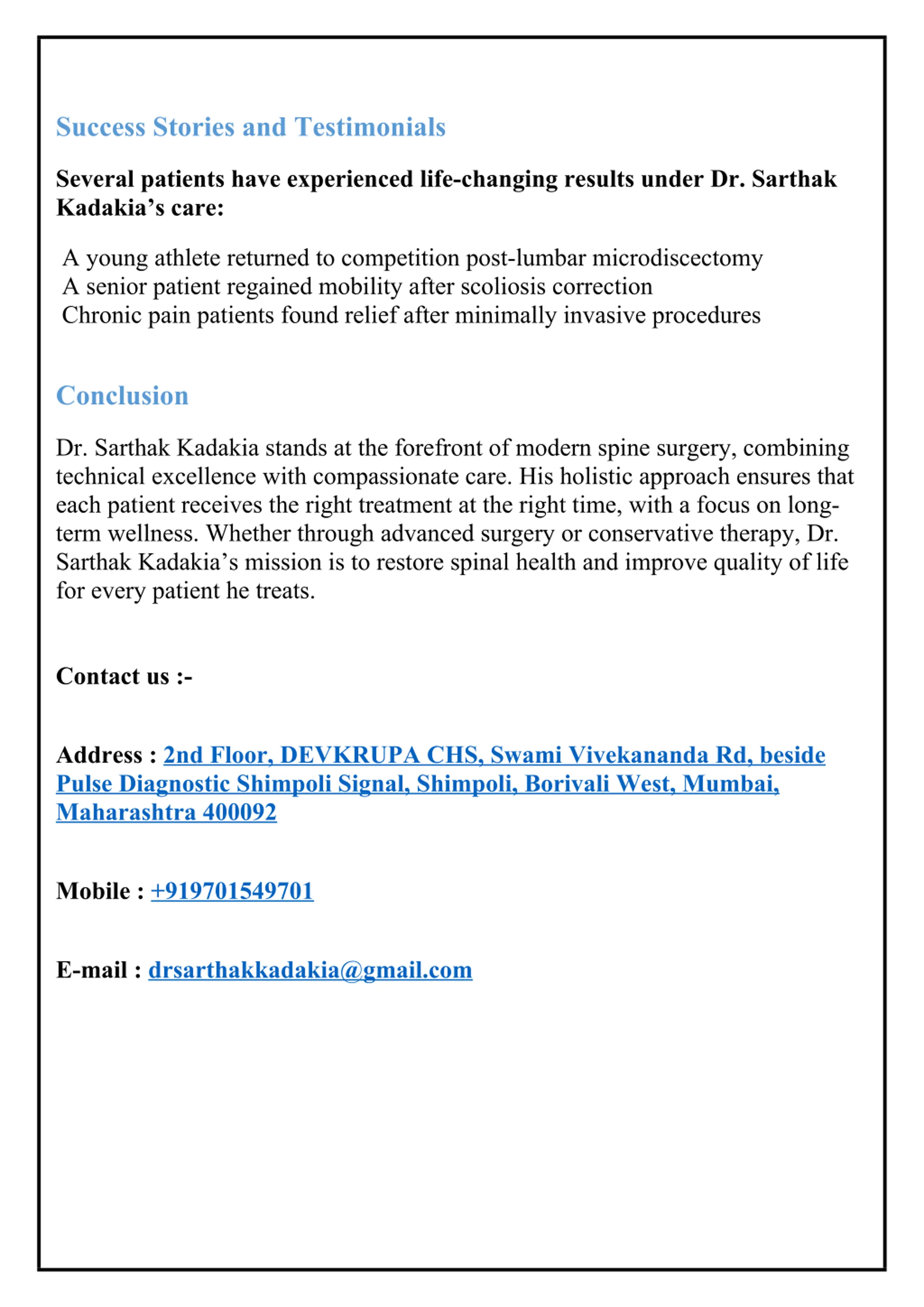 Success Stories and Testimonials Several patients have experienced life-changing results under Dr. Sarthak Kadakia s care: A young athlete returned to competition post-lumbar microdiscectomy A senior patient regained mobility after scoliosis correction Chronic pain patients found relief after minimally invasive procedures Conclusion Dr. Sarthak Kadakia stands at the forefront of modern spine surgery, combining technical excellence with compassionate care. His holistic approach ensures that each patient receives the right treatment at the right time, with a focus on long- term wellness. Whether through advanced surgery or conservative therapy, Dr. Sarthak Kadakia s mission is to restore spinal health and improve quality of life for every patient he treats. Contact us :- Address : 2nd Floor, DEVKRUPA CHS, Swami Vivekananda Rd, beside Pulse Diagnostic Shimpoli Signal, Shimpoli, Borivali West, Mumbai, Maharashtra 400092 Mobile : +919701549701 E-mail : drsarthakkadakia@gmail.com