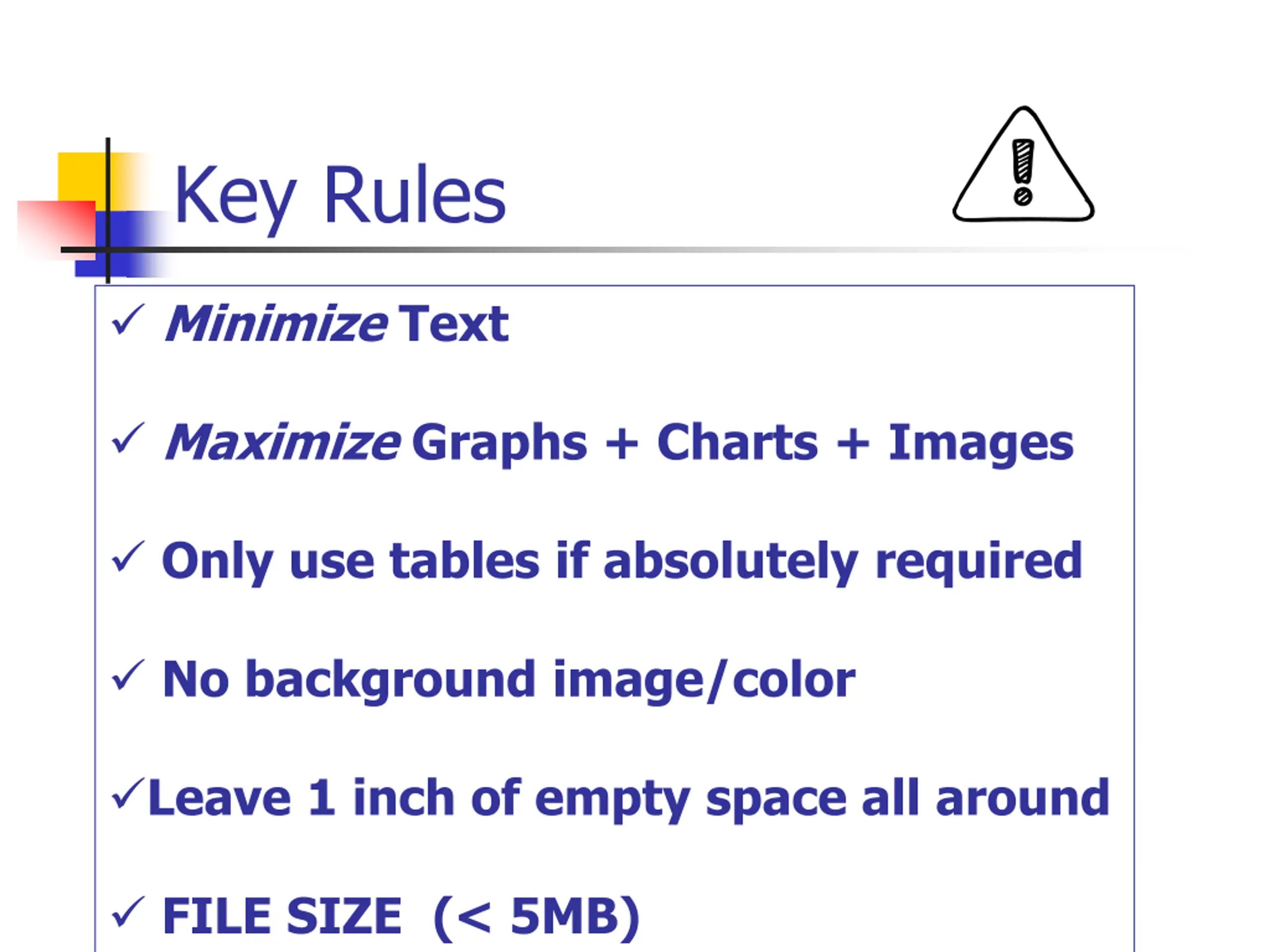 Key Rules Minimize Text Maximize Graphs + Charts + Images Only use tables if absolutely required No background image/color Leave 1 inch of empty space all around FILE SIZE (< 5MB)