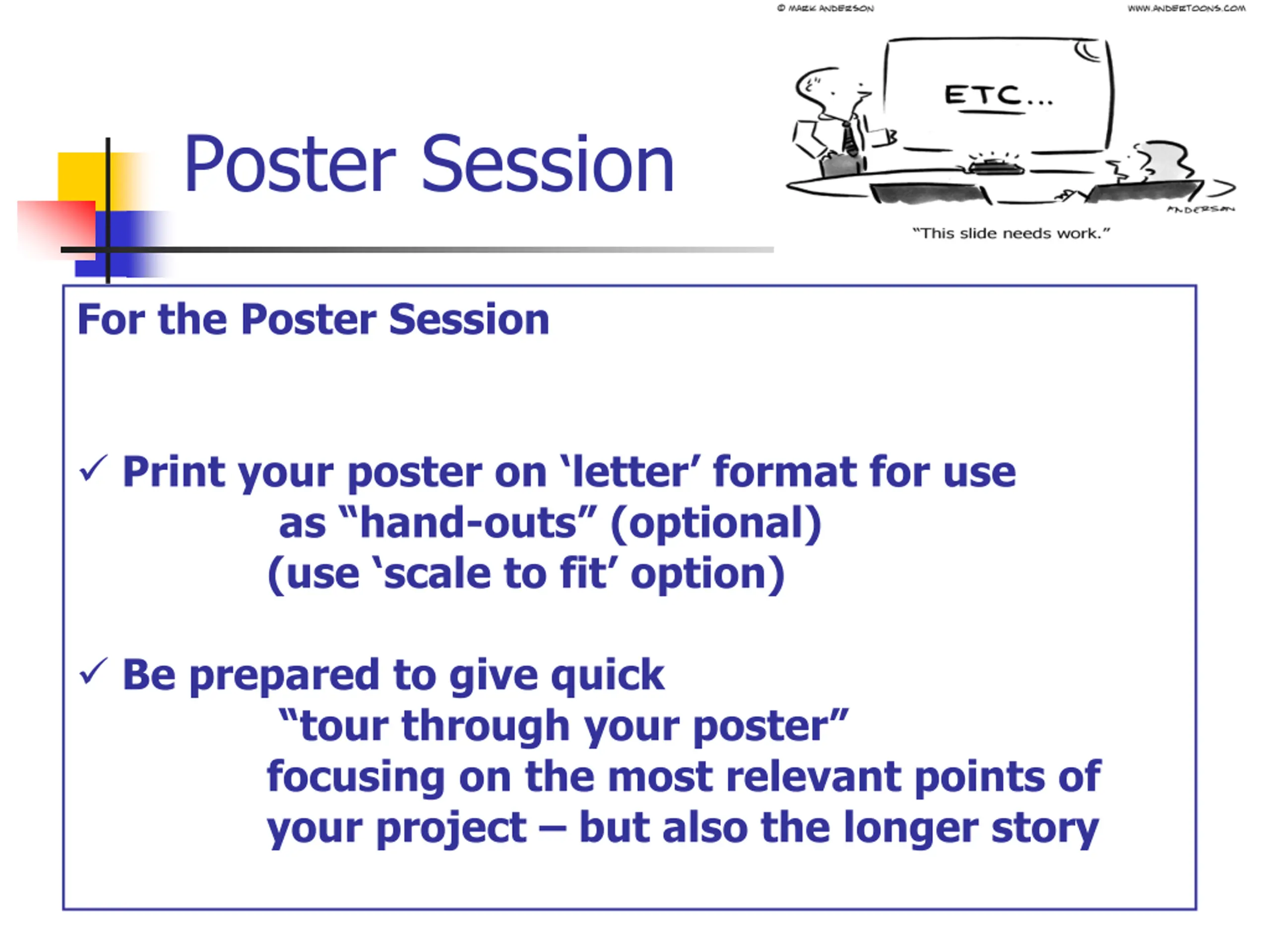 Poster Session For the Poster Session Print your poster on letter format for use as hand-outs (optional) (use scale to fit option) Be prepared to give quick tour through your poster focusing on the most relevant points of your project but also the longer story