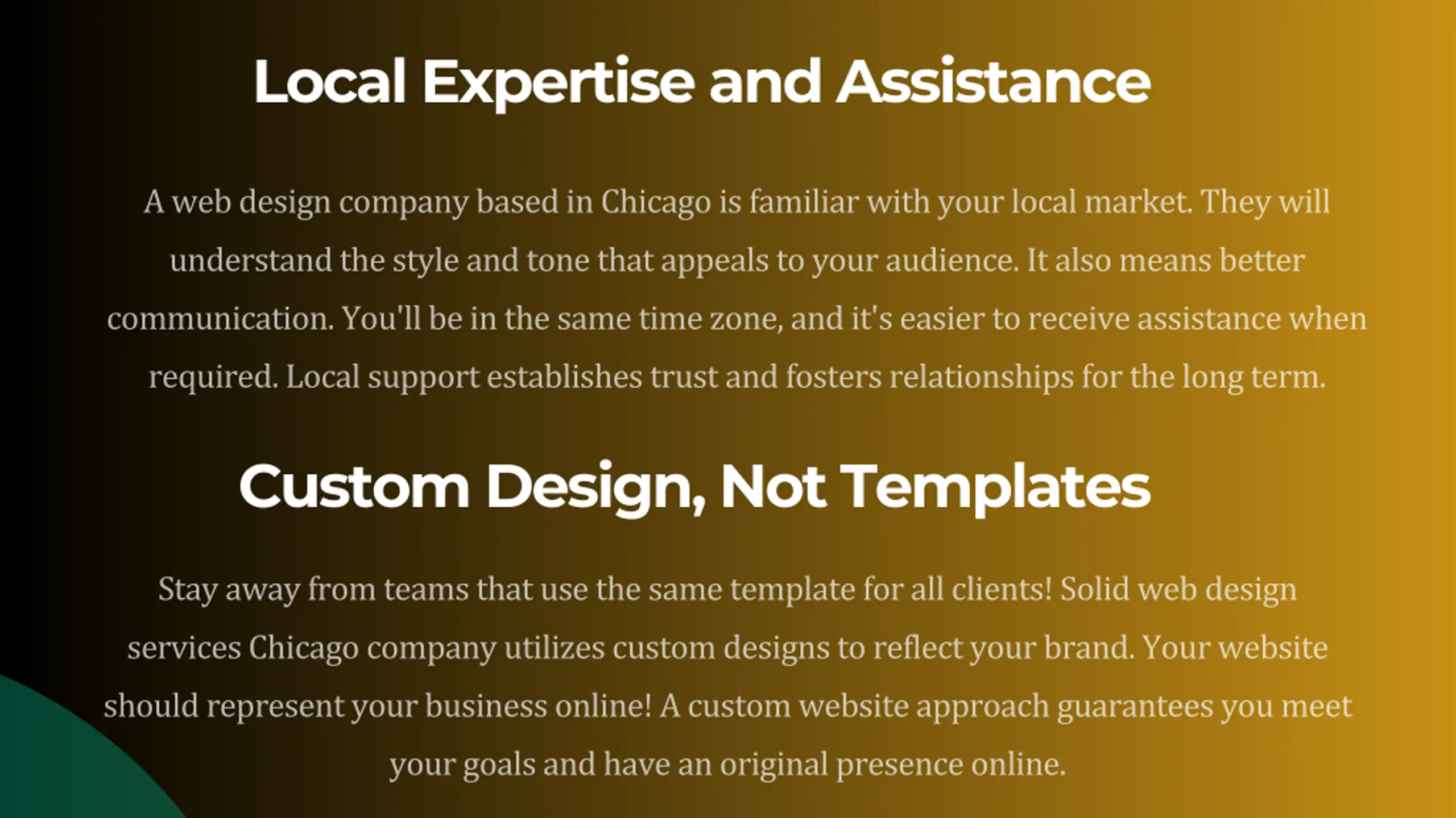 Local Expertise and Assistance A web design company based in Chicago is familiar with your local market. They will understand the style and tone that appeals to your audience. It also means better communication. You'll be in the same time zone, and it's easier to receive assistance when required. Local support establishes trust and fosters relationships for the long term. Custom Design, Not Templates Stay away from teams that use the same template for all clients! Solid web design services Chicago company utilizes custom designs to reflect your brand. Your website should represent your business online! A custom website approach guarantees you meet your goals and have an original presence online.